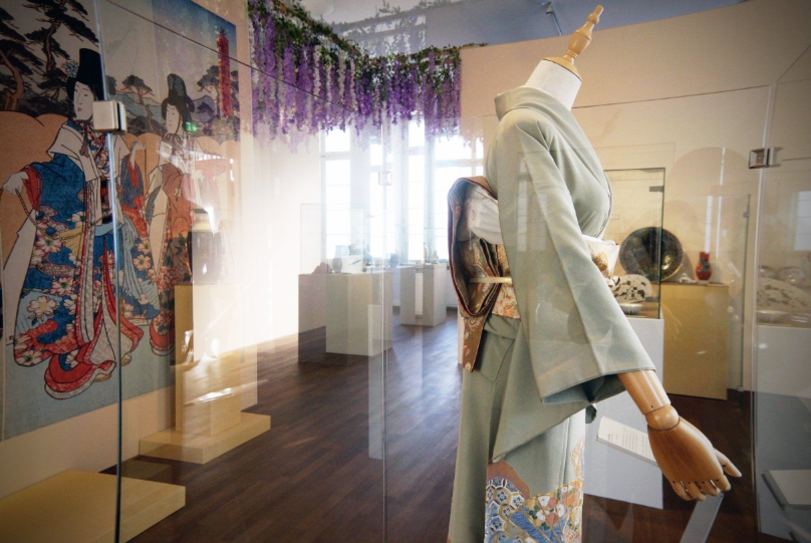 The exhibition focuses on Japanese arts and crafts of the 19th and early 20th centuries. This is juxtaposed with so-called Japonistic works - i.e. works of European manufacture inspired by the art of Japan. Most of the objects come from the Hildegard and Wilhelm Preker Collection, which was donated to the Hetjens-Museum. Loans from museum and private collections, such as the German Fächermuseum in Bielefeld, are also on display. The visitor experiences an elaborate staging, with painted and embroidered silk kimonos and flowers - even Japanese gold rain was attached to the museum ceilings.