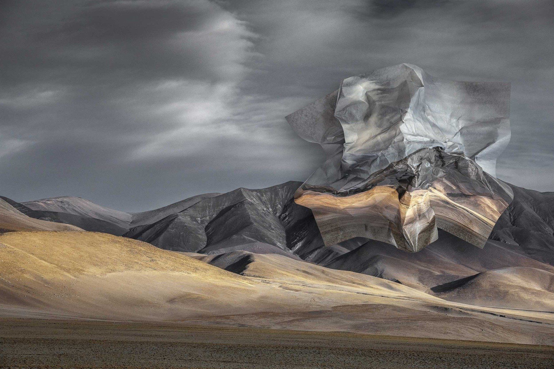 In her latest project, "Topographies of Fragility," she manipulates and distorts the seemingly perfect landscapes that she herself has traveled and whose environmental destruction by humans has begun. This process with photographic paper allows her to explore the contradictory relationship between man and nature. In her first attempts, she realized that the fragility of the paper is a poetic allusion to man's relationship with the planet.