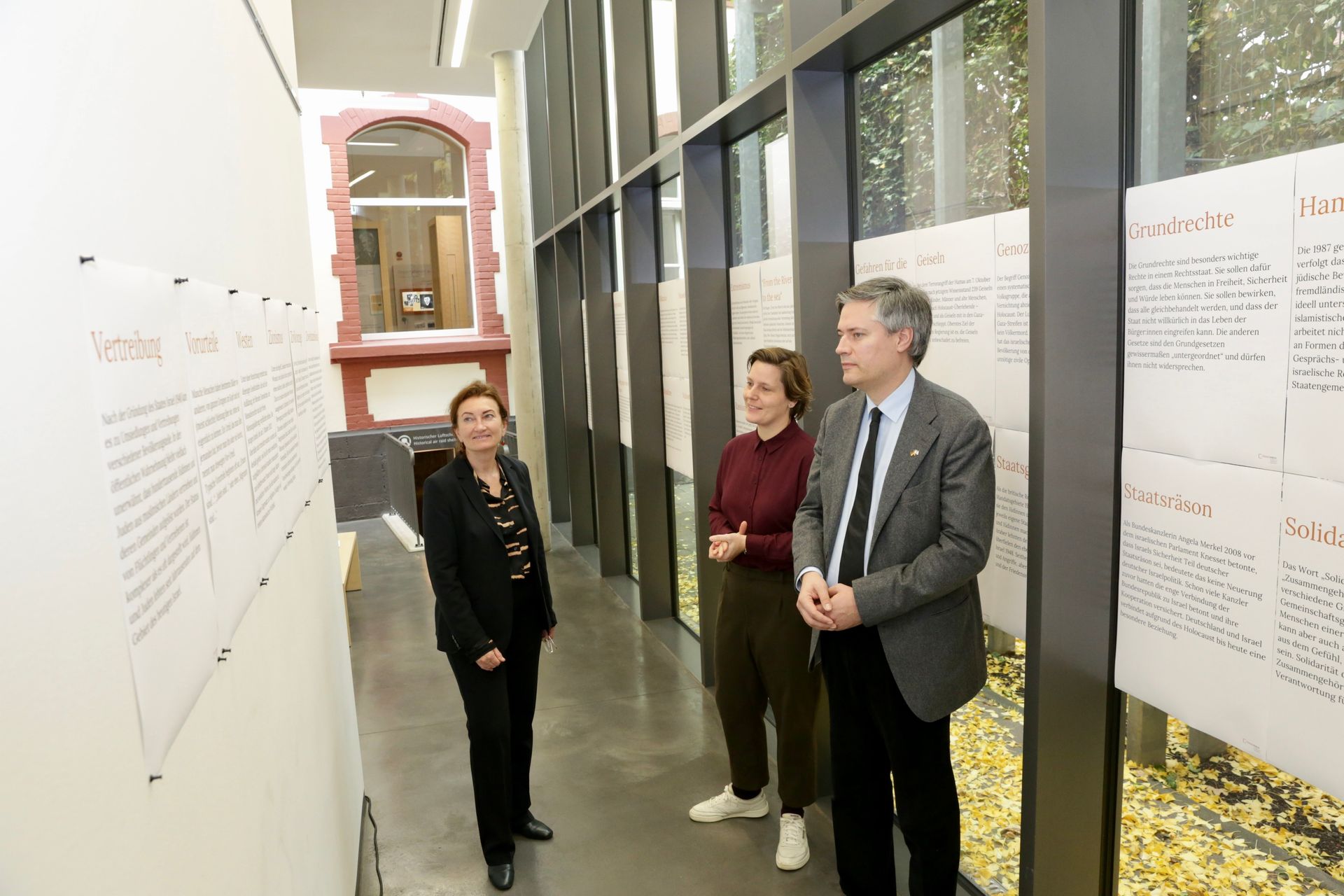 Bastian Fleermann und Astrid Hirsch-von Borries von der Mahn- und Gedenkstätte stellten Miriam Koch, Beigeordnete für Kultur und Integration das "Lexikon an der Glasfassade" vor © Landeshauptstadt Düsseldorf/Ingo Lammert