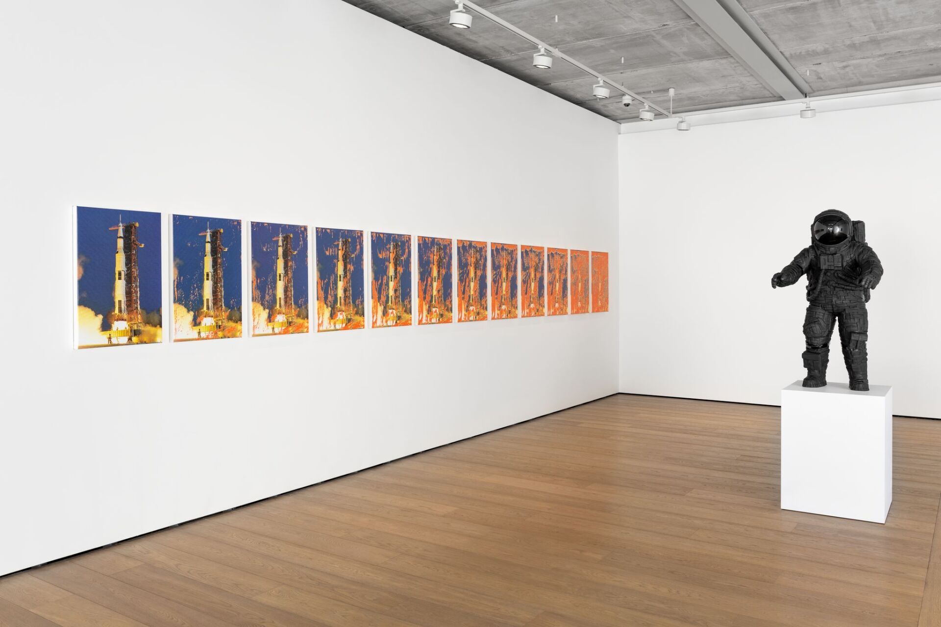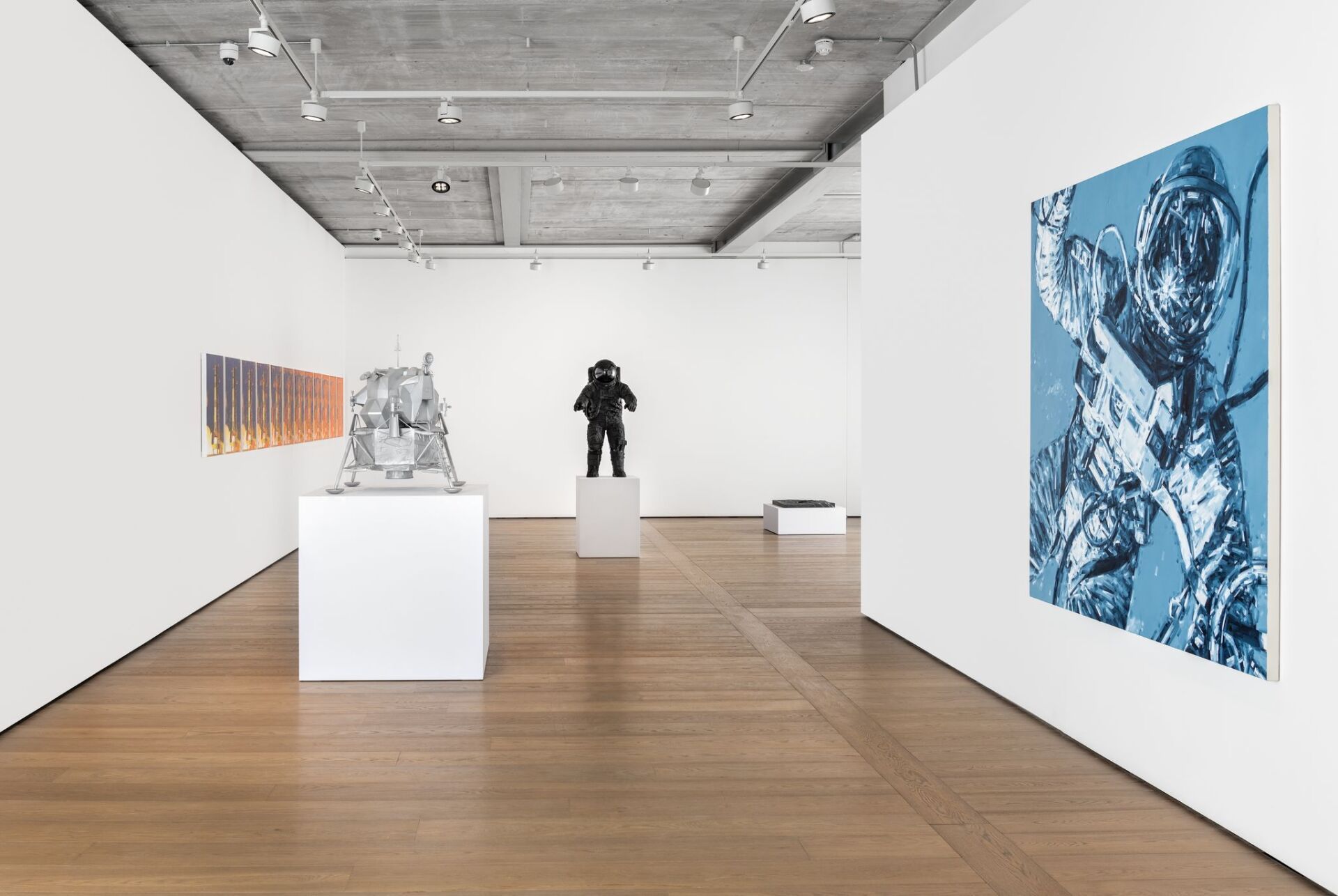 This exhibition is a short 'timeline' of the three space programmes that took us to the moon: Mercury, Gemini and Apollo. As you enter the gallery, you see three giant rocket images of the famous John Glenn launch that put the first American into orbit. This set the stage for Project Gemini, which can be seen in the centre of the gallery in a painting of a hovering astronaut... the first spacewalk with Ed White. The last room of the gallery represents the culmination of the Mercury and Gemini missions: the Apollo programme. Working with sculptures was interesting and important to the installation because I could really take the viewer through the exhibition and create a narrative.