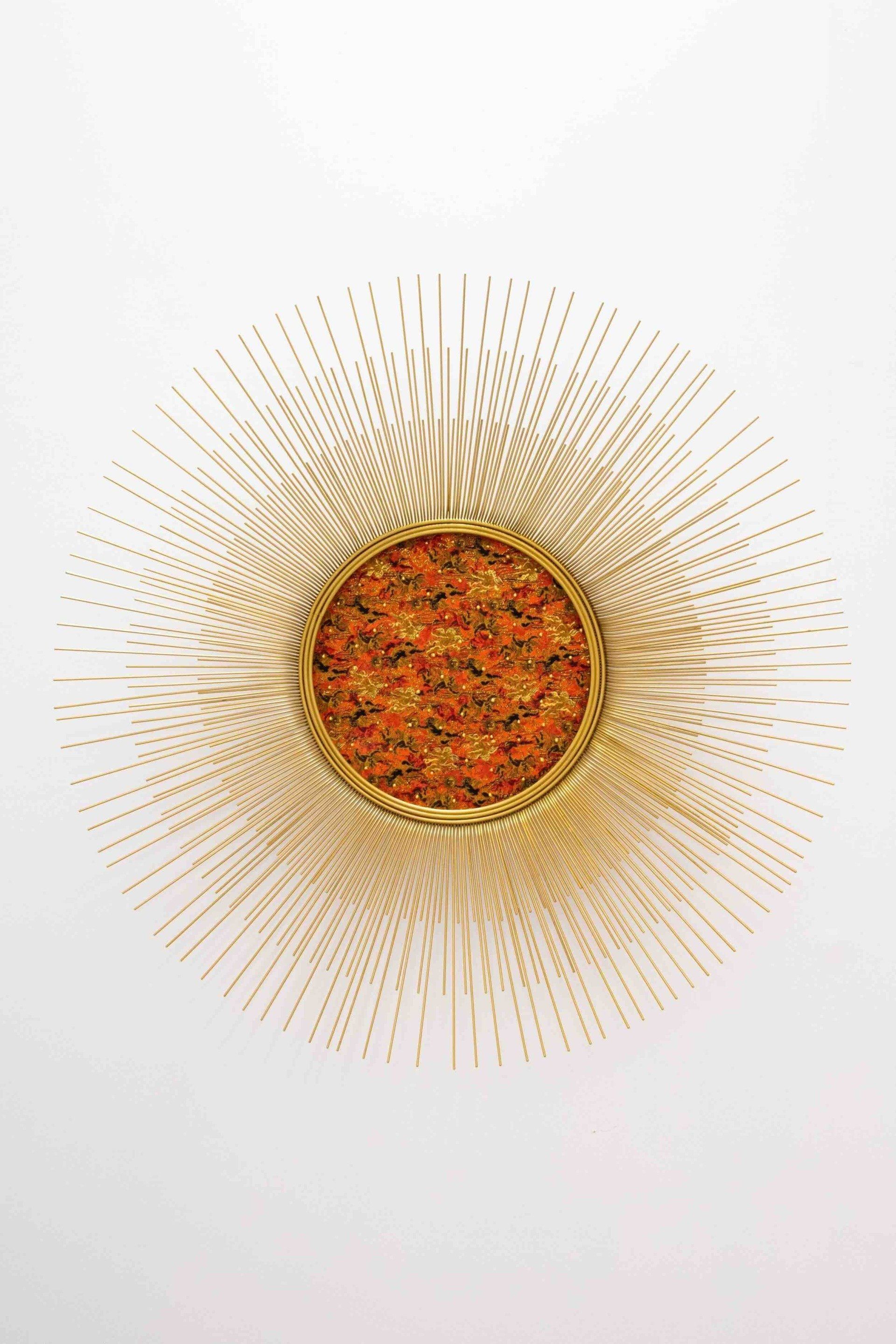 Jedes Kunstwerk besteht aus handgefertigtem, bemaltem Metall und Glas, das mit 24-karätigem Blattgold, Diamantstaub und Archivtinte auf 300 g/m² Somerset Satin verziert ist und auf das ikonische Sunburst-Rahmendesign verweist.