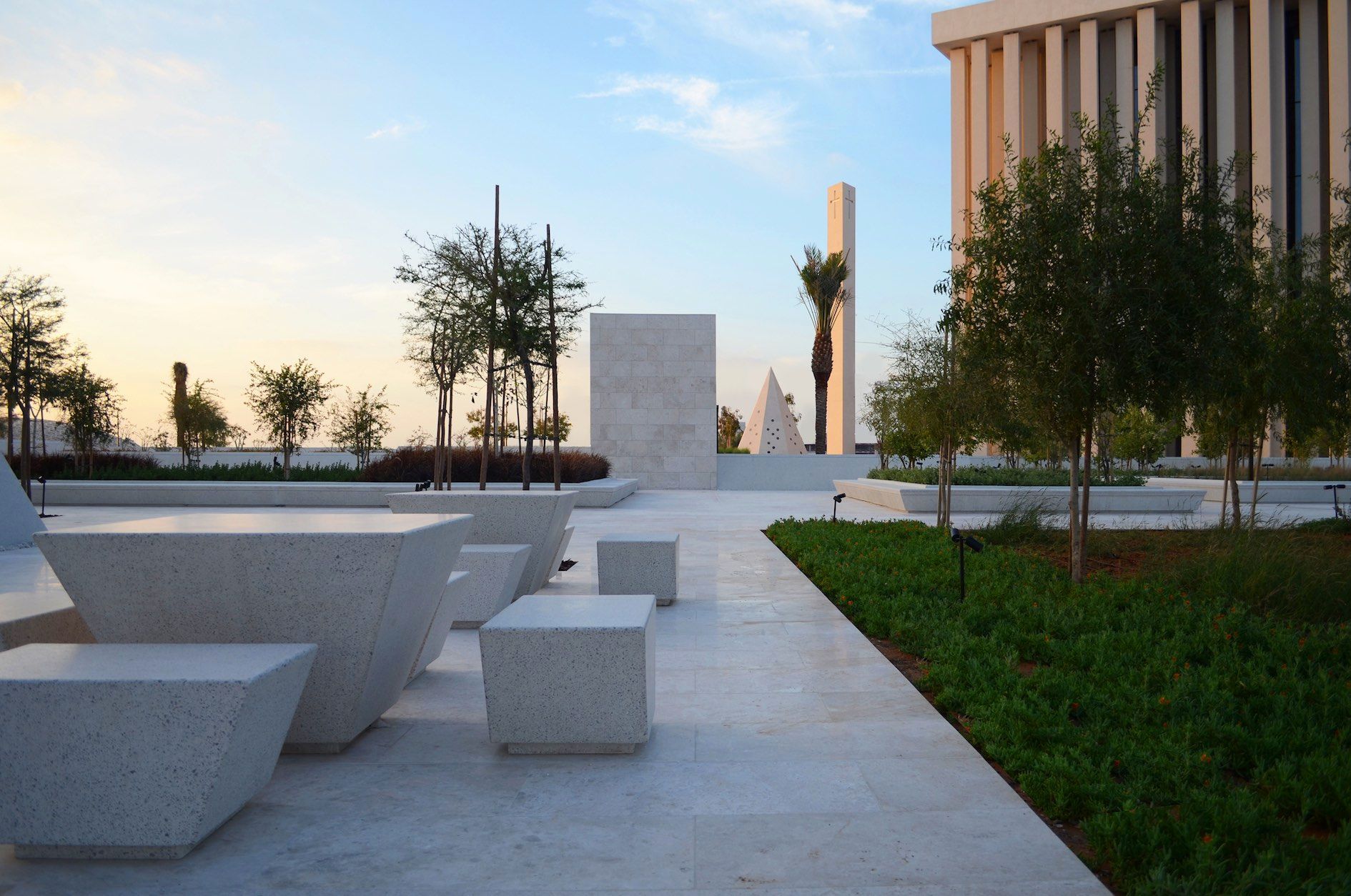 The Abrahamic Family House’s communal gardens is defined by planters, water features, and bench seating.