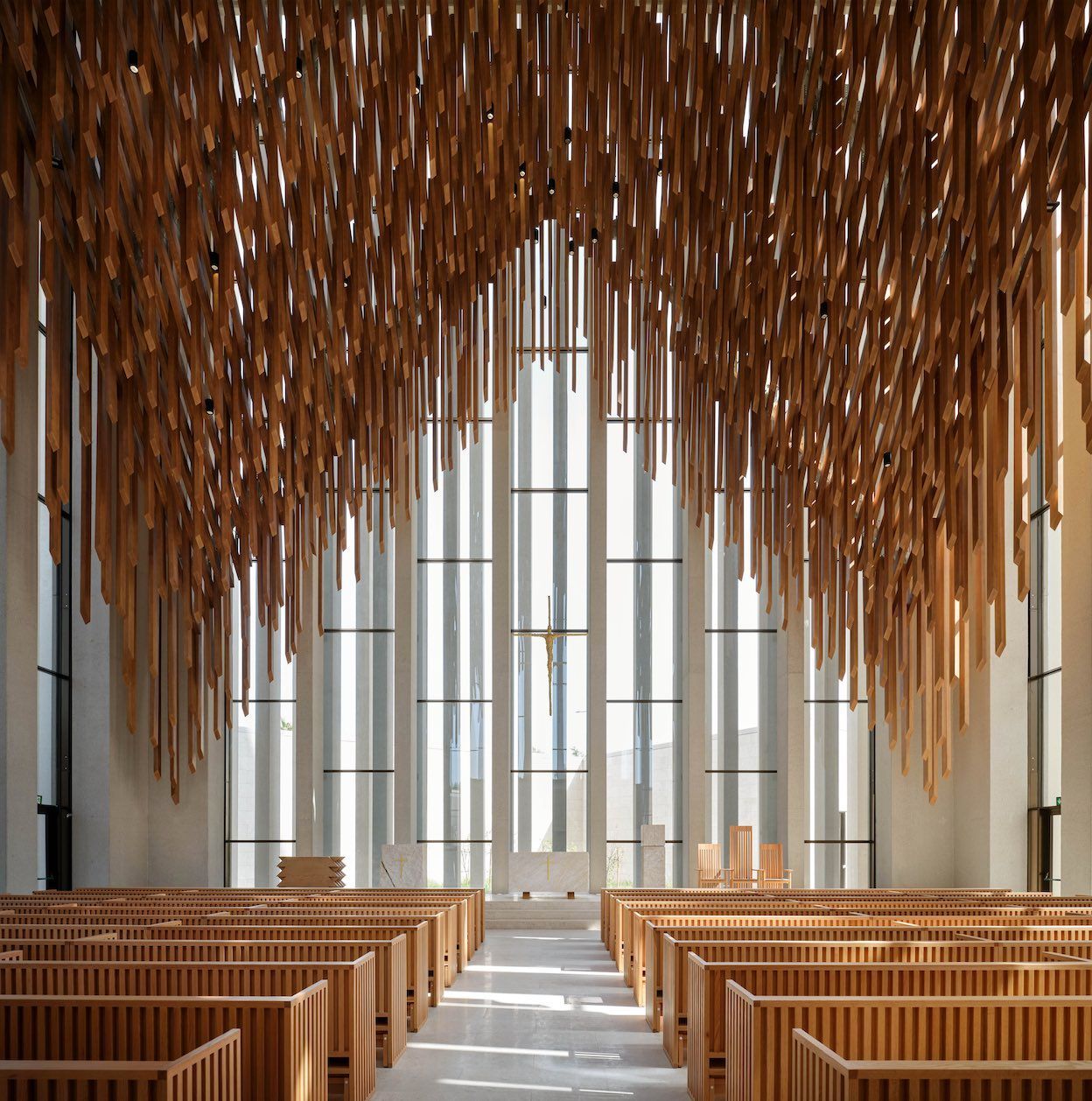 His Holiness Francis Church interior features a pyramidal form of linear timber battens that hang above oak pews facing the altar.
