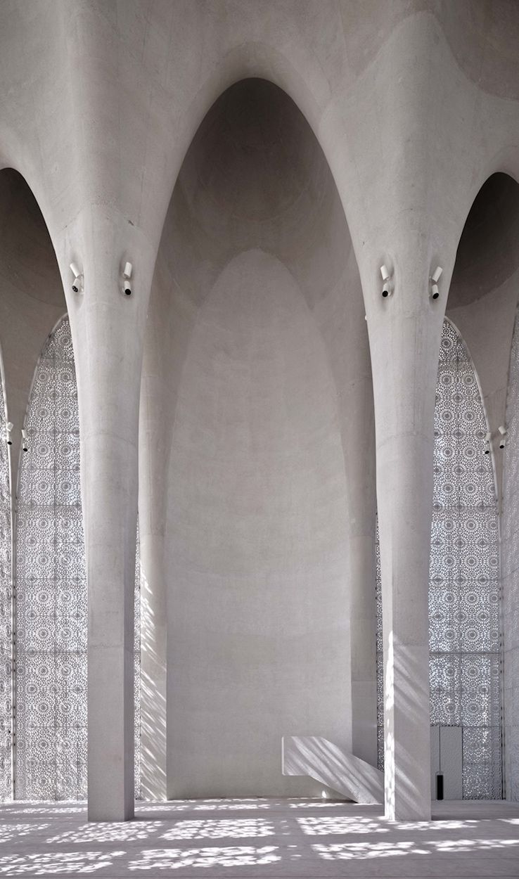 Upon entering each place of worship, visitors are flooded with light while hot air is drawn from the surroundings to the ornate ceilings, tempering the interior. The buildings are made of a cream-coloured concrete that deflects the heat of the sun and references the sand and mountains of the Emirates.