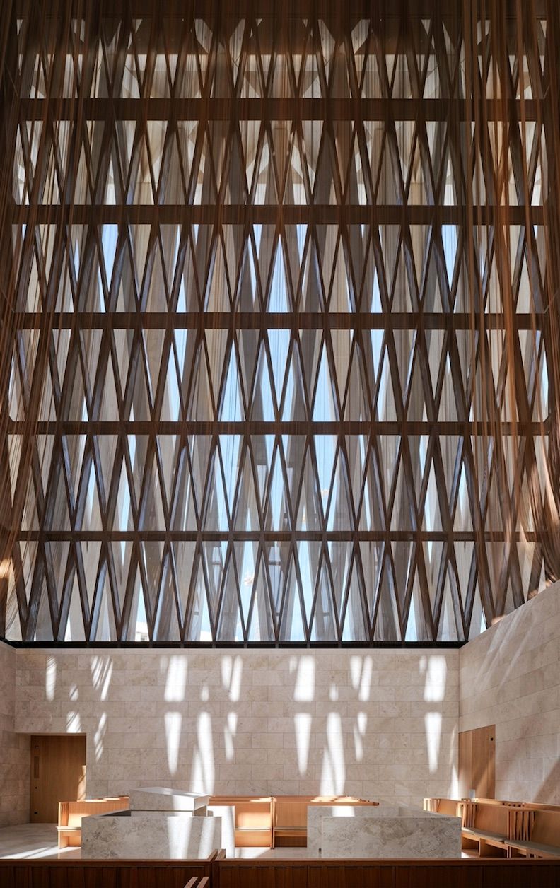 Light enters the Moses Ben Maimon Synagogue through three layers of V-shaped columns and a bronze mesh tent which drapes over the congregation.