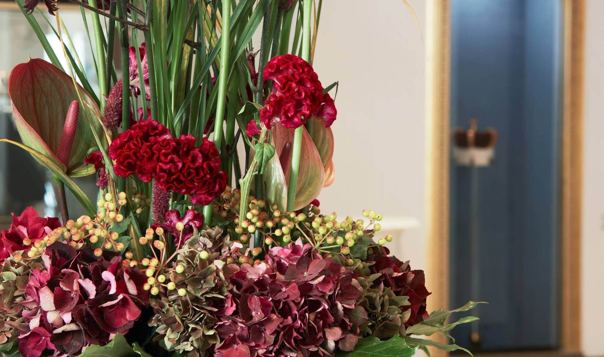 The luminous shimmer of gold leaf is immediately noticeable upon entering the foyer. The famous Medici Renaissance ceiling is painted with antique quotes. The special feature of the coffered ceiling is formed by four coats of arms embedded on the central axis of the ceiling. Of these, one bead in dark blue bears the Medici coat of arms. The ceiling is a faithful replica of the famous coffered ceiling of San Lorenzo, the Medici family church in Florence, one of the first sacred Renaissance buildings.