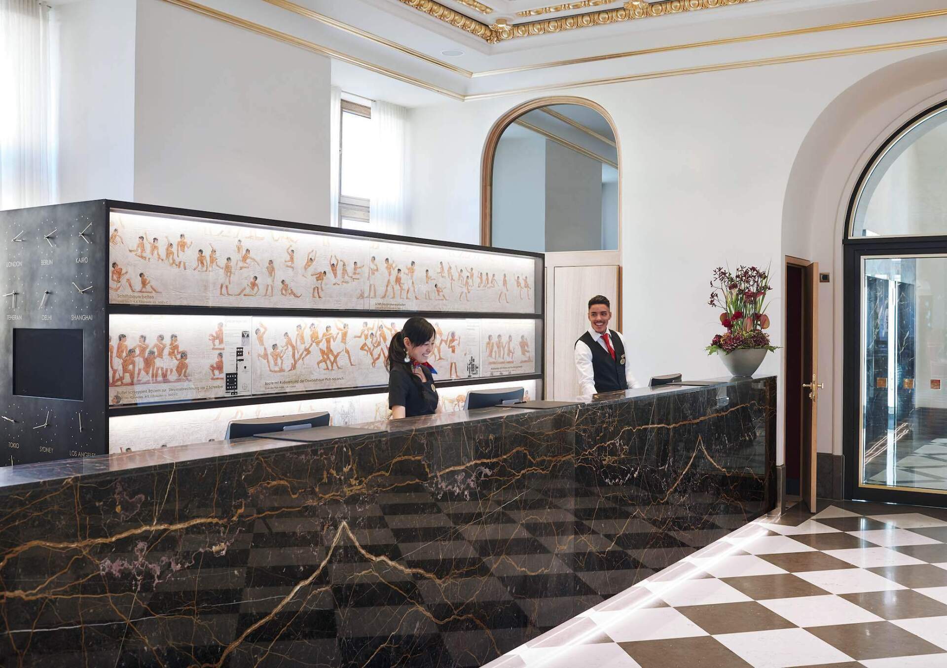 The reliefs at the reception desk depict ancient Egyptian scenes of everyday life, all of which relate to the Nile, Egypt's lifeline.