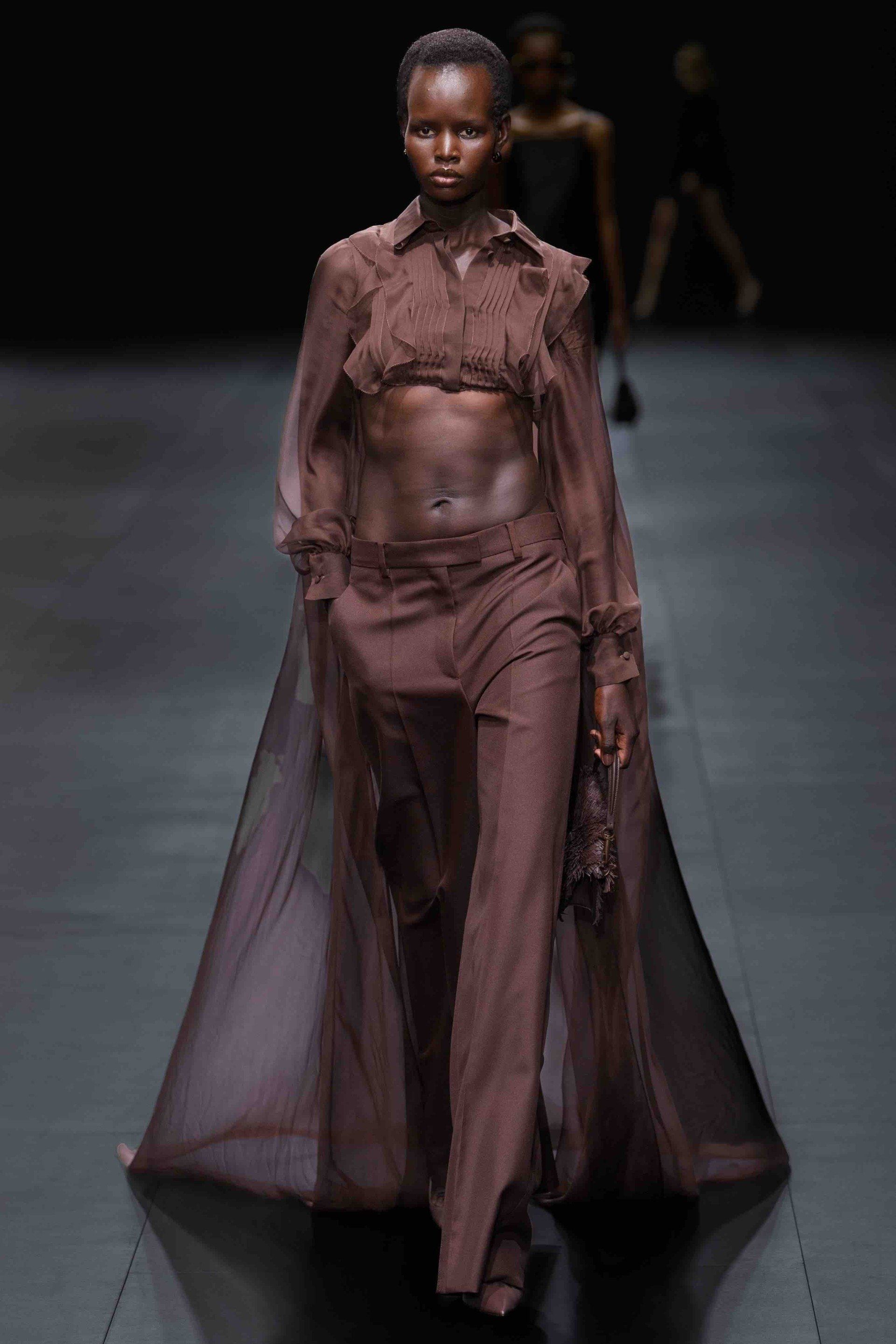 The predominant colors were nude and brown, interrupted by occasional color highlights, such as bright blue, green, red and yellow. Brown is making its fashion comeback for the first time since the 90s. Brown stands for stability and down-to-earthness. Was the simple collection a sobering after the spectacular outfits of the Pink PP collection in Paris in March and The Beginning Haute Couture FW 22/23 presented on the Spanish Steps in Rome in July?