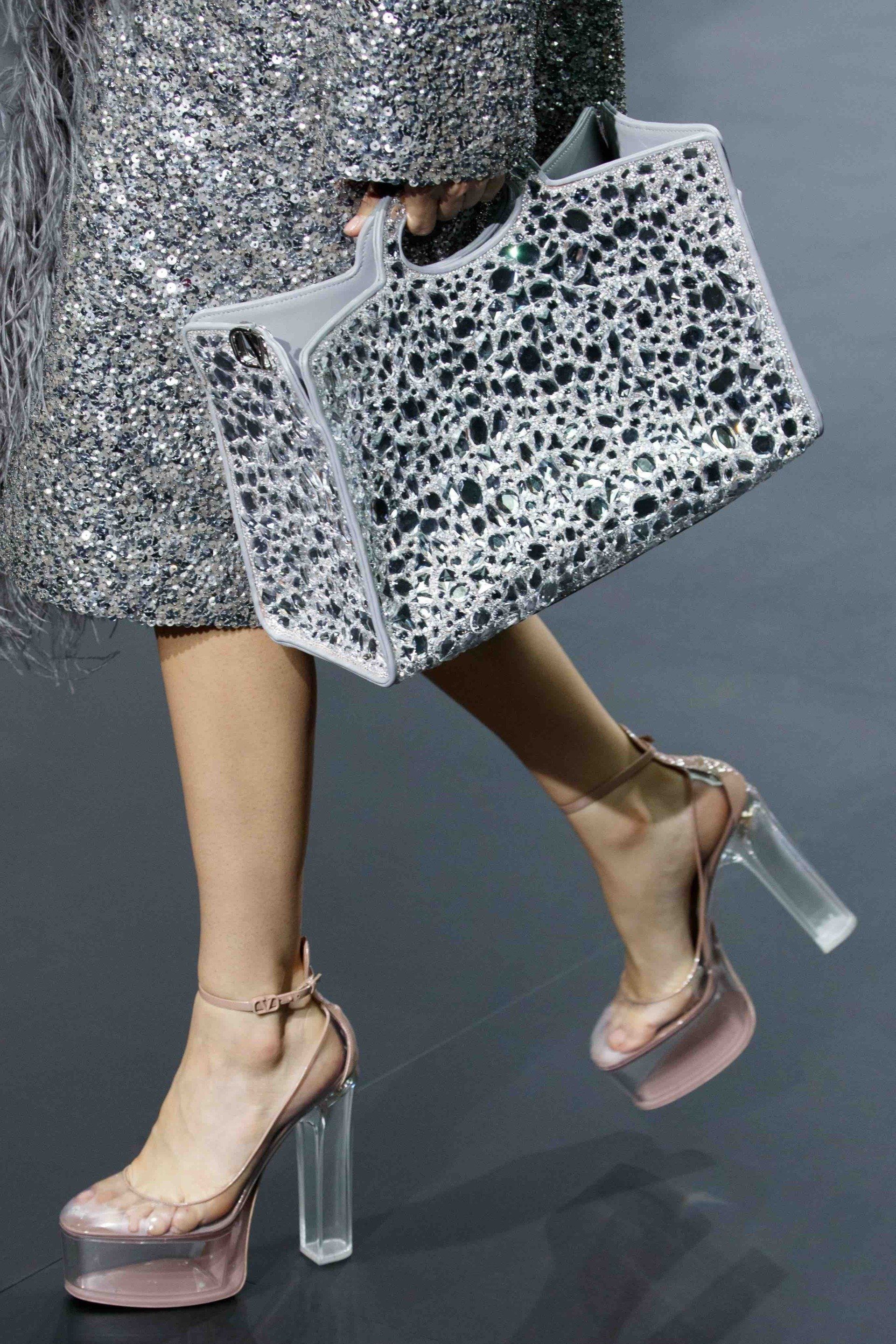 Valentino Fans können sich auf neue Handtaschen-Deklinationen freuen. Valentino hat neue Modelle entwickelt, mit dem V-Logo und dem Stud, einer Hommage an römische Säulen. Zu sehen sind alle Formen von Handtaschenformen in iPhone Größe bis hin zur Einkaufstasche, die für Herren konzipiert ist. Ausgestattet sind die Taschen mit dem Valentino Stud Symbol oder dem Valentino Toile Iconographe in Schwarz, Braun und Nude Tönen, verziert mit Pailletten oder Federn.