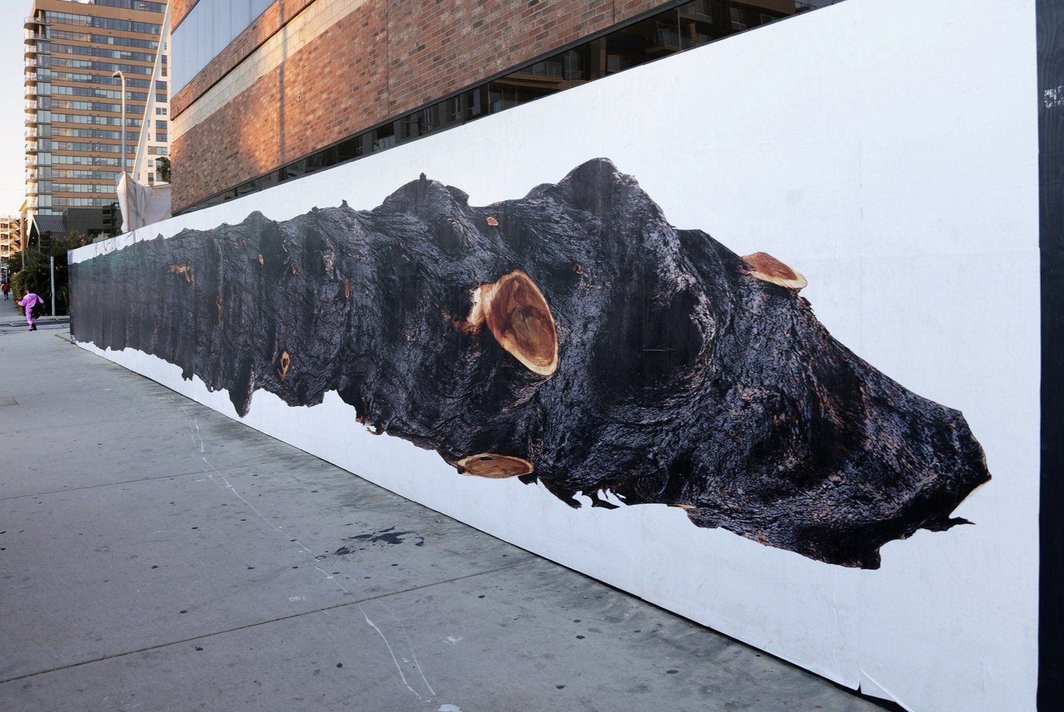 It then became clear very quickly how important it wasfor this body of works to be shown directly in the public realm. It needed to reach beyond the gallery walls. After its early days as a project on Instagram, Fire Complex has been shown on digital and paper billboards in the London and in a flyposting campaign on the occasion of COP 26 across the UK. The video work that is now on view at the Royal Academy was first shown on massive digital screen on the front of ahigh-rise building in Downtown LA and as a series of oversized billboard installations in Hollywood. These works in the urban environment brought the scale of the disaster into focus. At the same time, I staged a billboard performance in which all the stumps left over in the community after the clear up process were billboarded on top of one another, one layer of history drowning out the next. I should also mention that the presentations of the work in the public realm included QR codes that linked people back to information about how to support organisations that are actively engaged in forest regeneration.