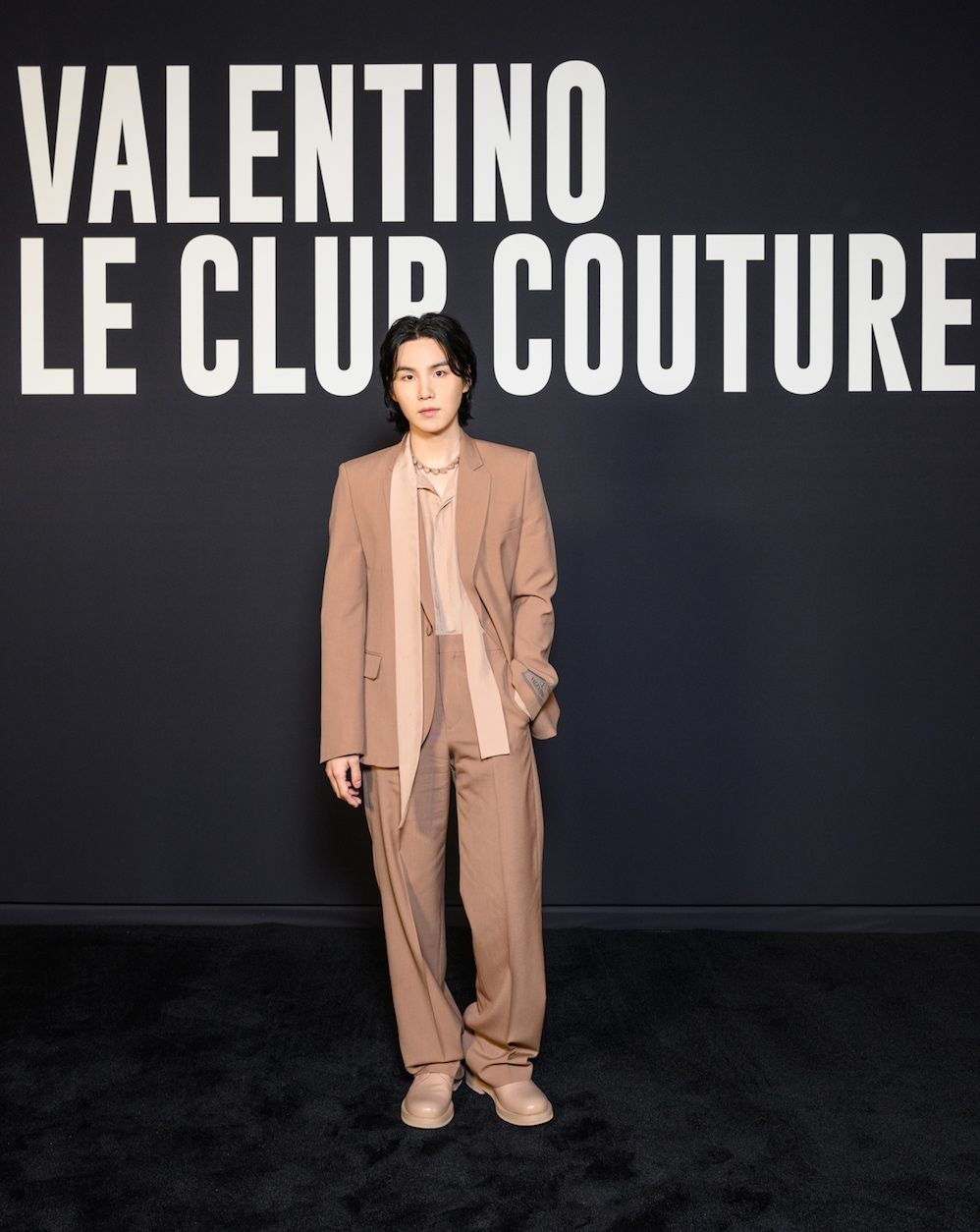 After the Maison recently snapped up rapper, producer and member of BTS, Suga as its new brand ambassador, he also arrived at the Paris airport that morning. The whole world had followed his journey and the Ponte Alexander was full of waiting screaming fans. For his haute couture debut and first Paris frontrow assignment, Suga opted for a pale brown suit over a cream camel blouse and a beige tie scarf from the Unboxing Valentino collection. He also wore a beige necklace and beige dress shoes with it. There was a storm of excitement worldwide on social media as Suga respectfully averted his gaze when a model's top slipped off on the catwalk.