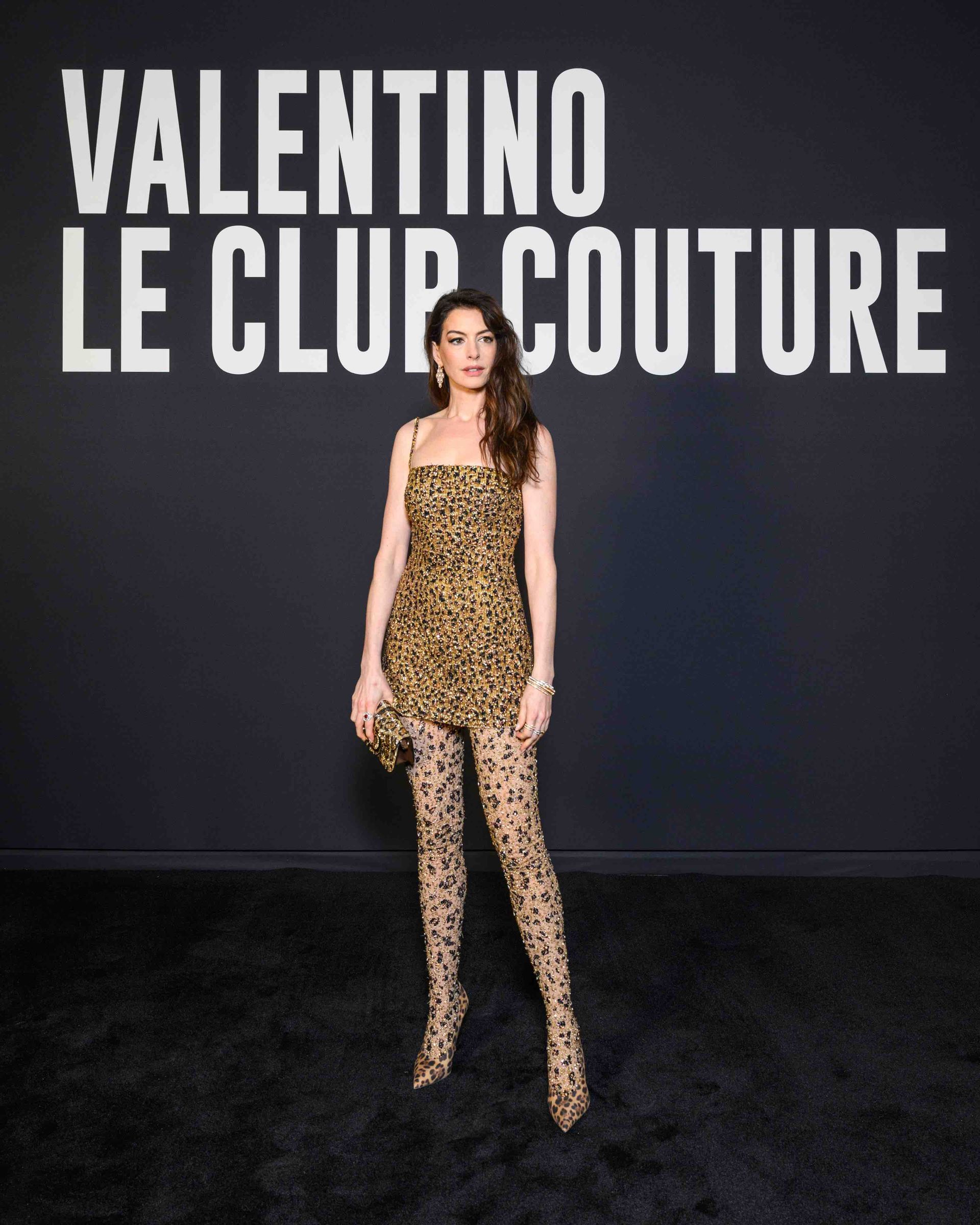 Many stars and influencers accepted the Valentino invitation, like Anne Hathaway, with husband Adam Shulman. She wore a Valentino leopard mini dress with sequins and crystals, heavily embroidered leopard tights and matching crystal clutch. Also seated in the front row were Sam Smith, Charli XCX, Baz Elvis director Bay Luhrmann and his wife costume designer Catherine Martin, and Ashley Park from Emily in Paris.