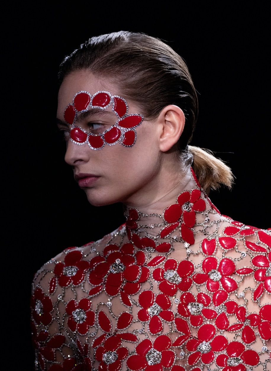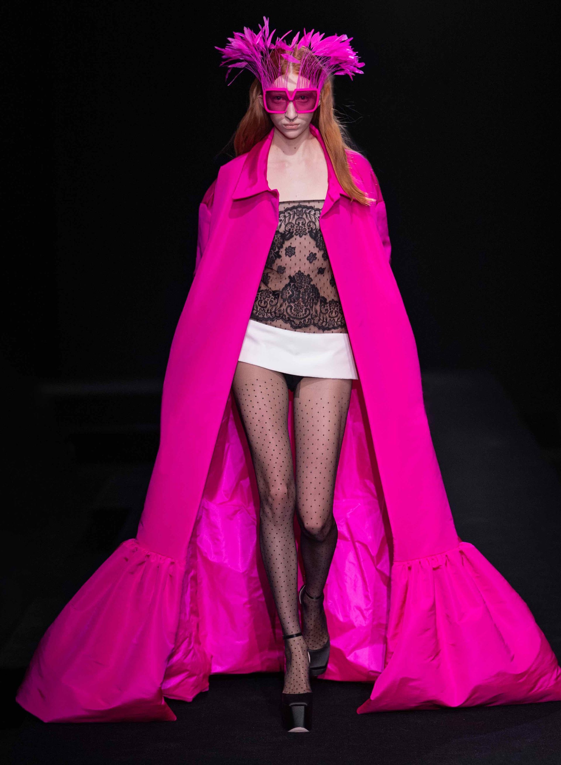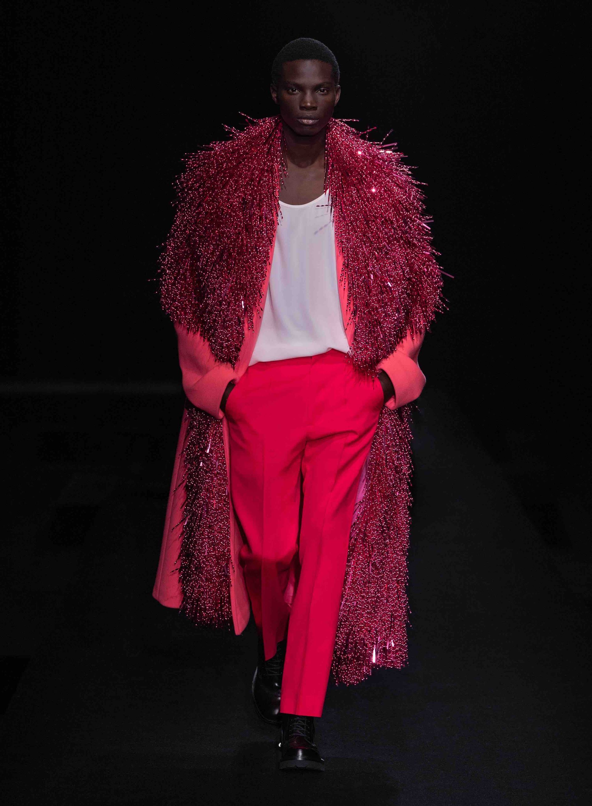 Sequined mini dresses with opera gloves and a lot of ruffled dresses in pink combined with black and also green could be seen. Graphic black and white elements appeared and of course the Valentino red in different shades. Strikingly beautiful were the many coat creations in different cuts, some so long that they had a train. When there were tight-fitting creations, they were playful with ruffles or bows or encrusted with crystals and sequins so that the silhouette was elegantly veiled. Also present at the show was Valentino's trademark PP Pink, which only appeared sporadically as a belt, men's jumper or coat.