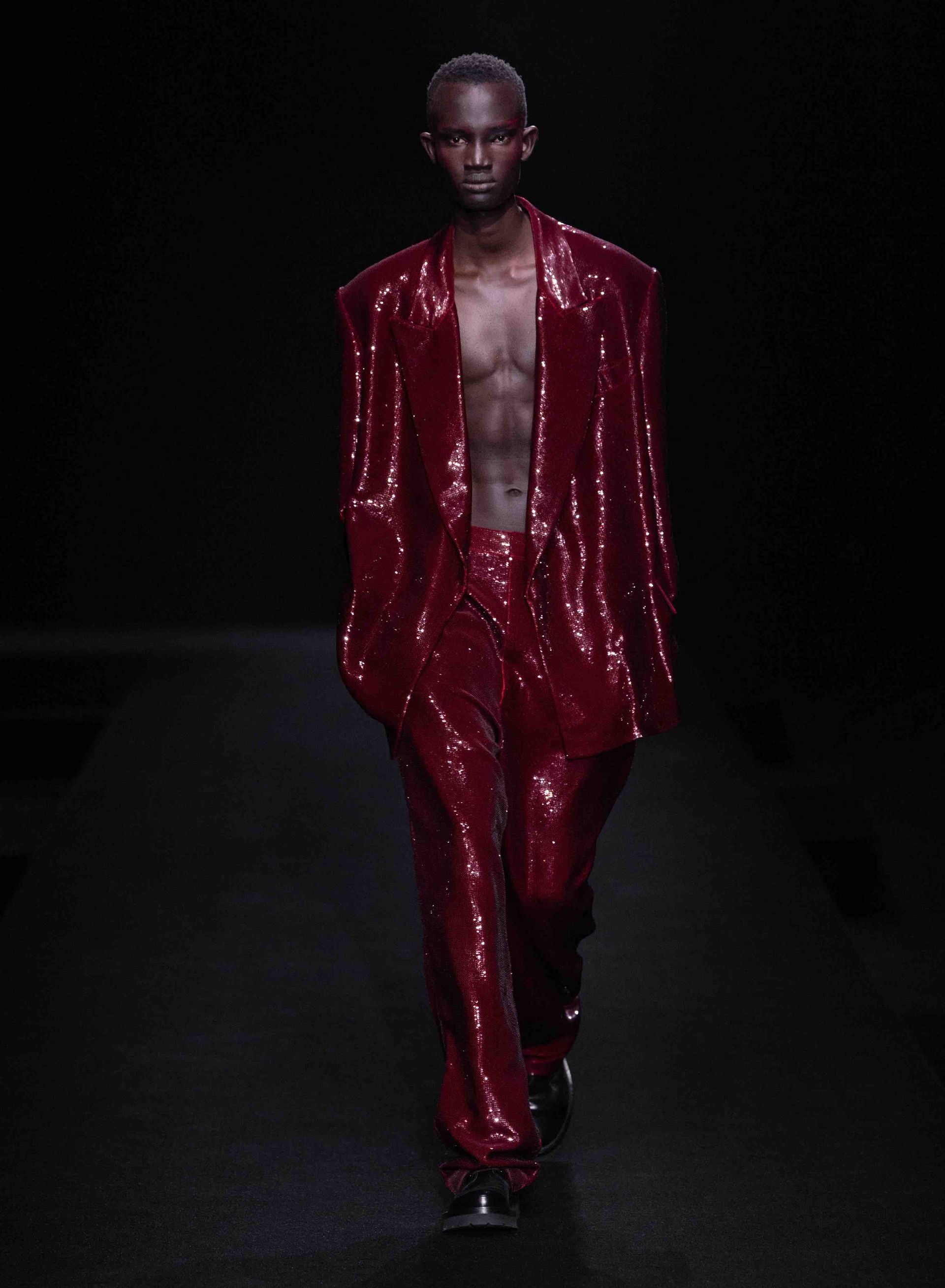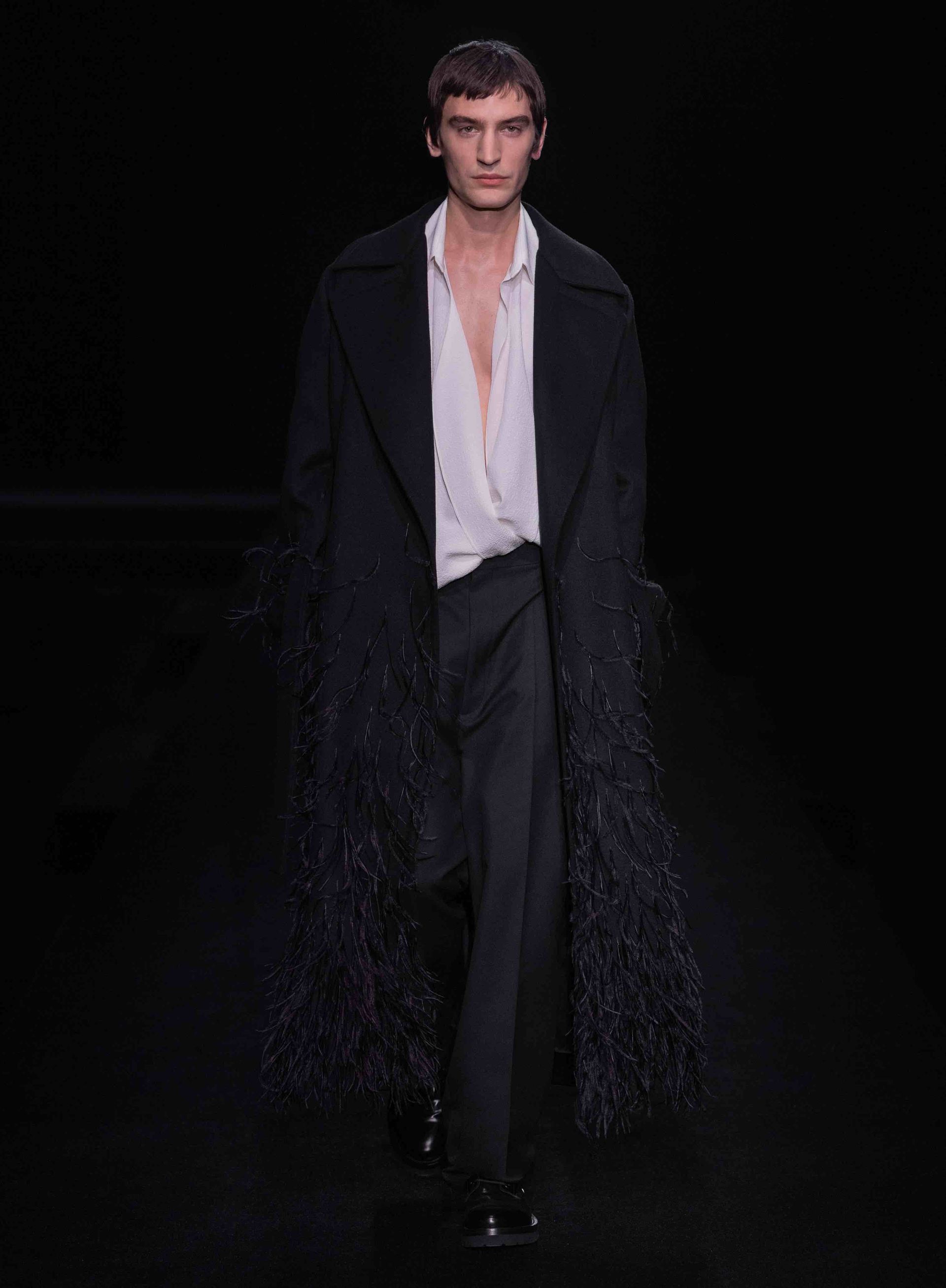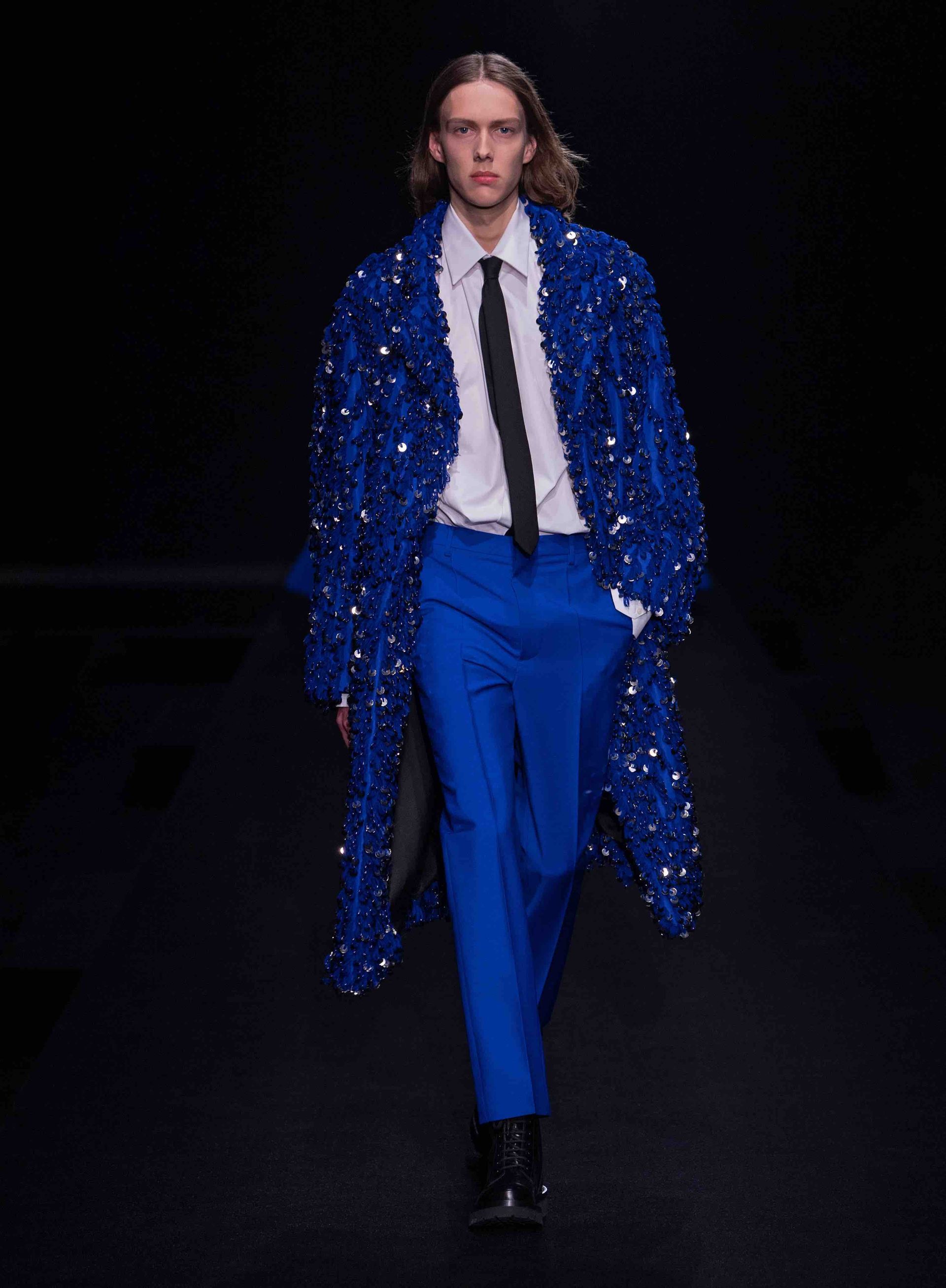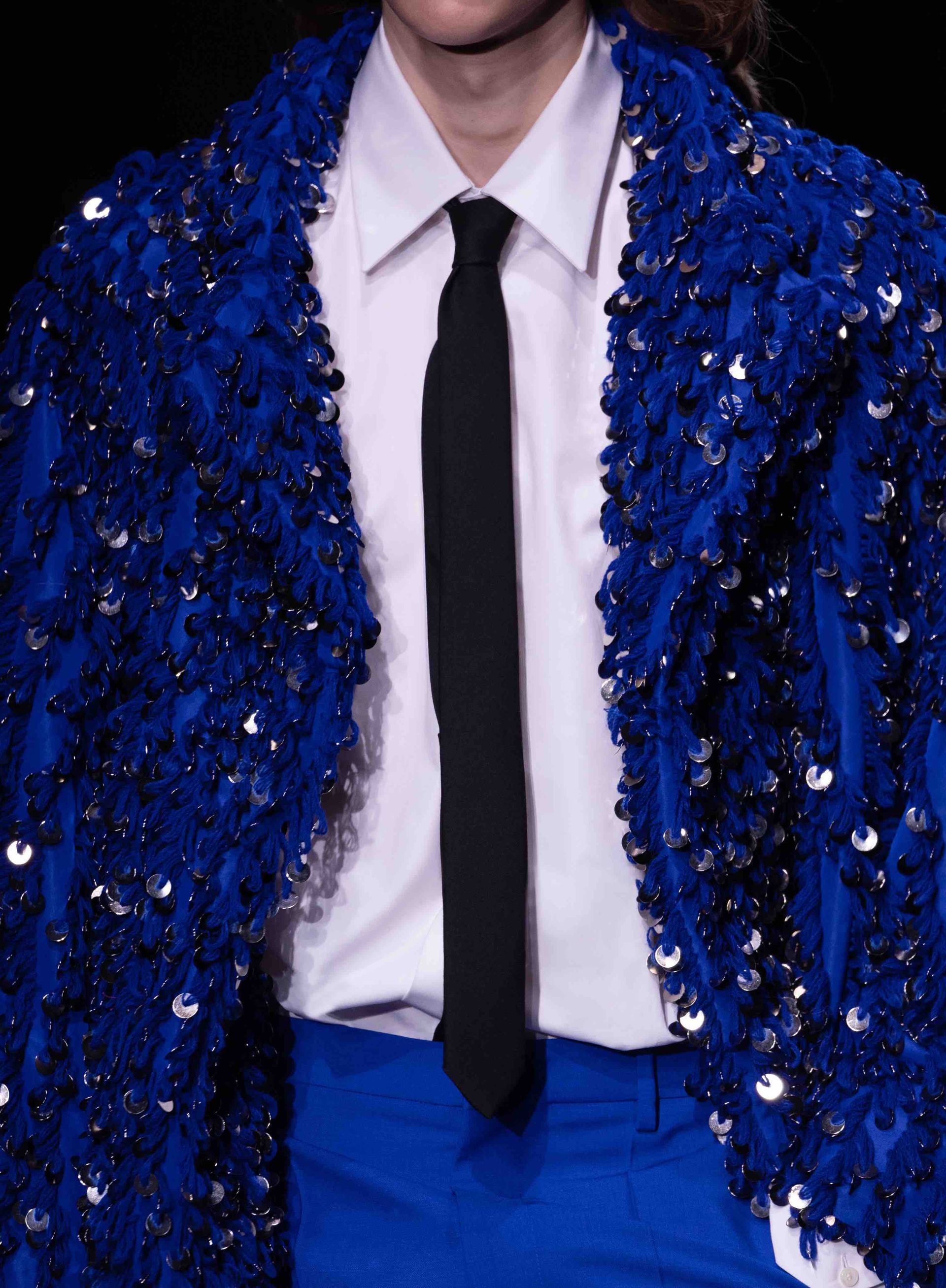 Oversized jackets and trench coats in bright colours like emerald green, blue with oversized sequins or soft in even poudre. Bordeaux-coloured sequin suit blazers, black men's coats with feathers, or plain men's organza blouses. The cuts were reminiscent of the 90s, but seemed contemporary and cool. The absolute highlight was a black men's tulle coat with embroidery.