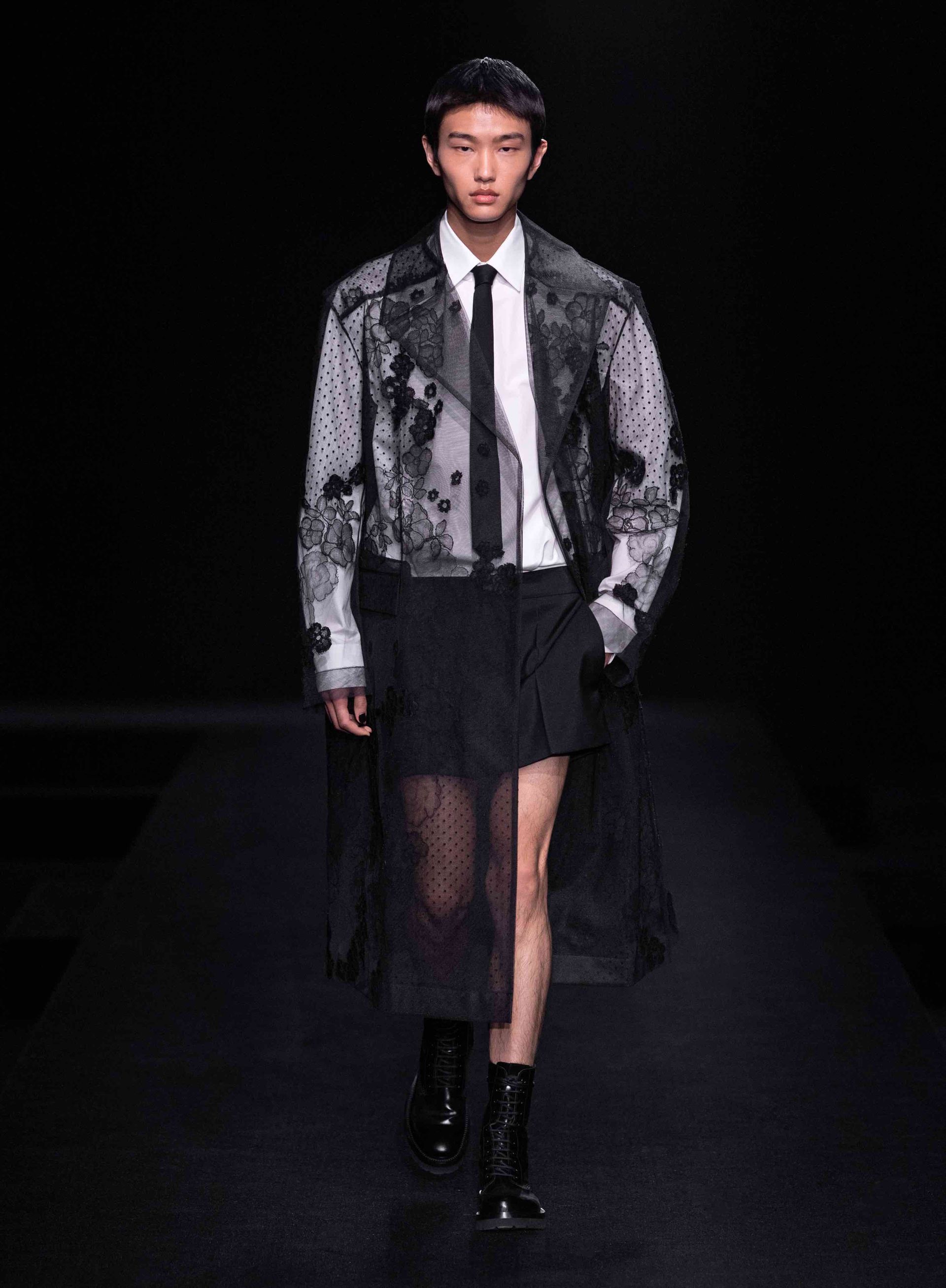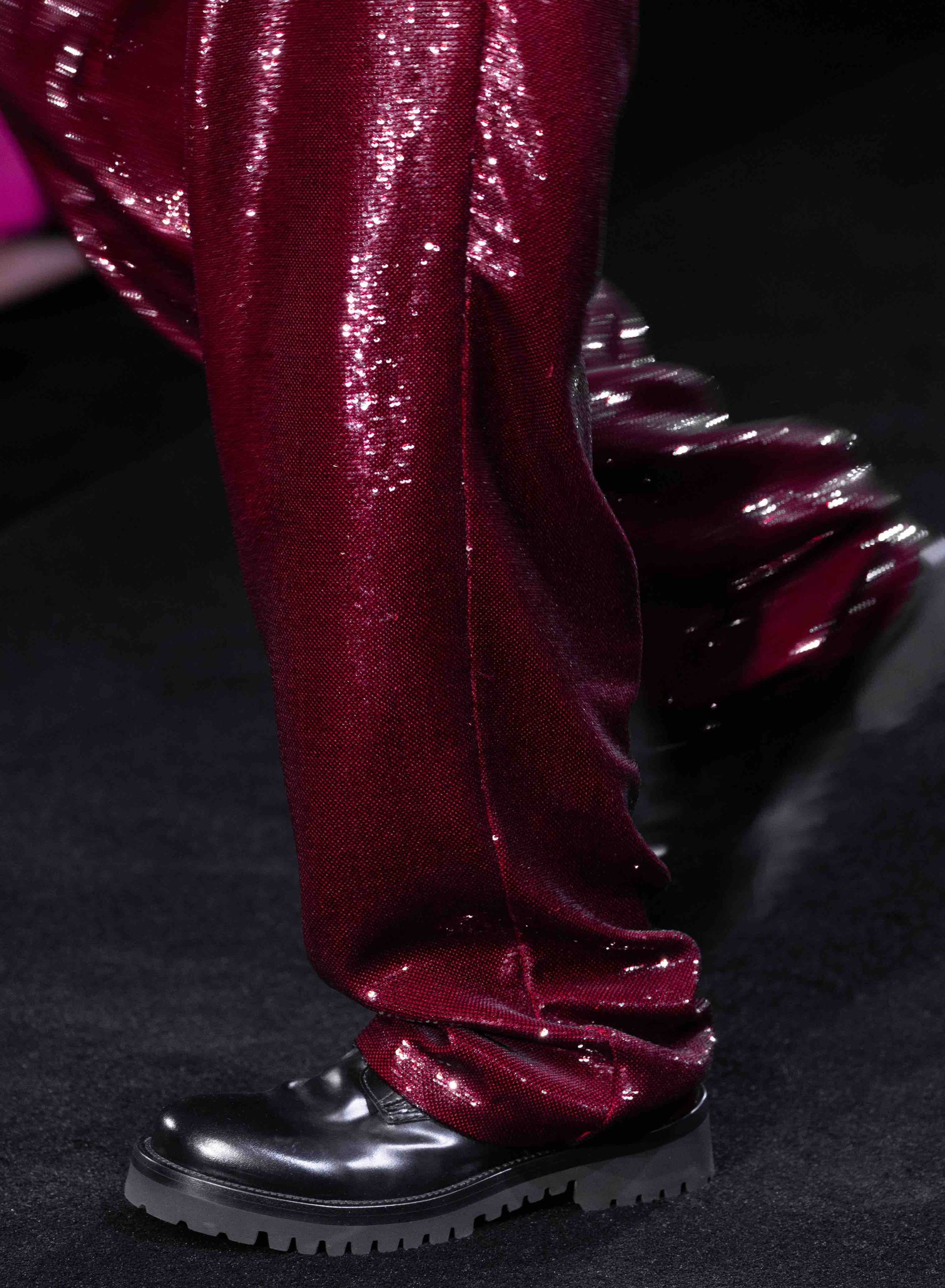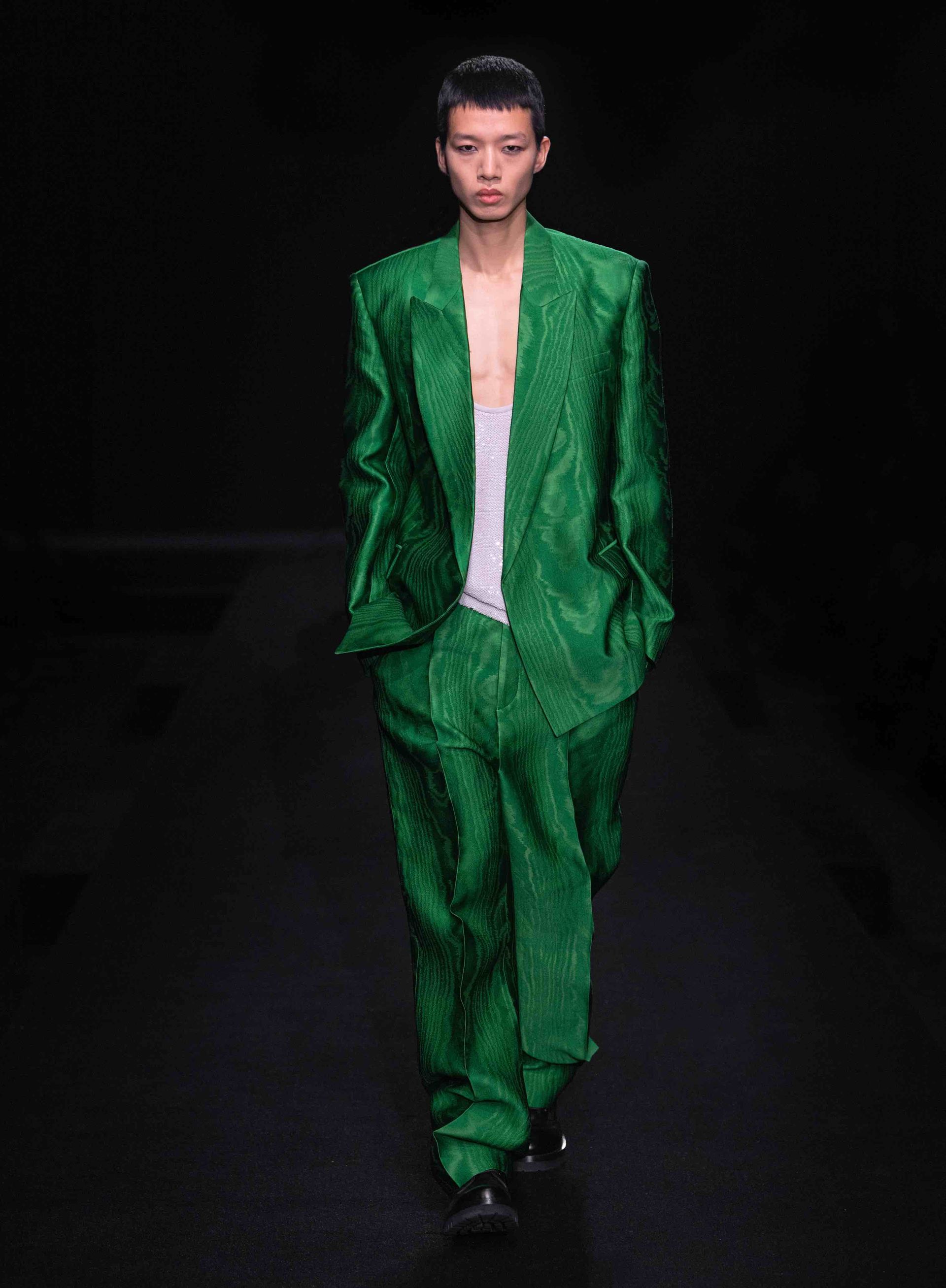 Oversized jackets and trench coats in bright colours like emerald green, blue with oversized sequins or soft in even poudre. Bordeaux-coloured sequin suit blazers, black men's coats with feathers, or plain men's organza blouses. The cuts were reminiscent of the 90s, but seemed contemporary and cool. The absolute highlight was a black men's tulle coat with embroidery.