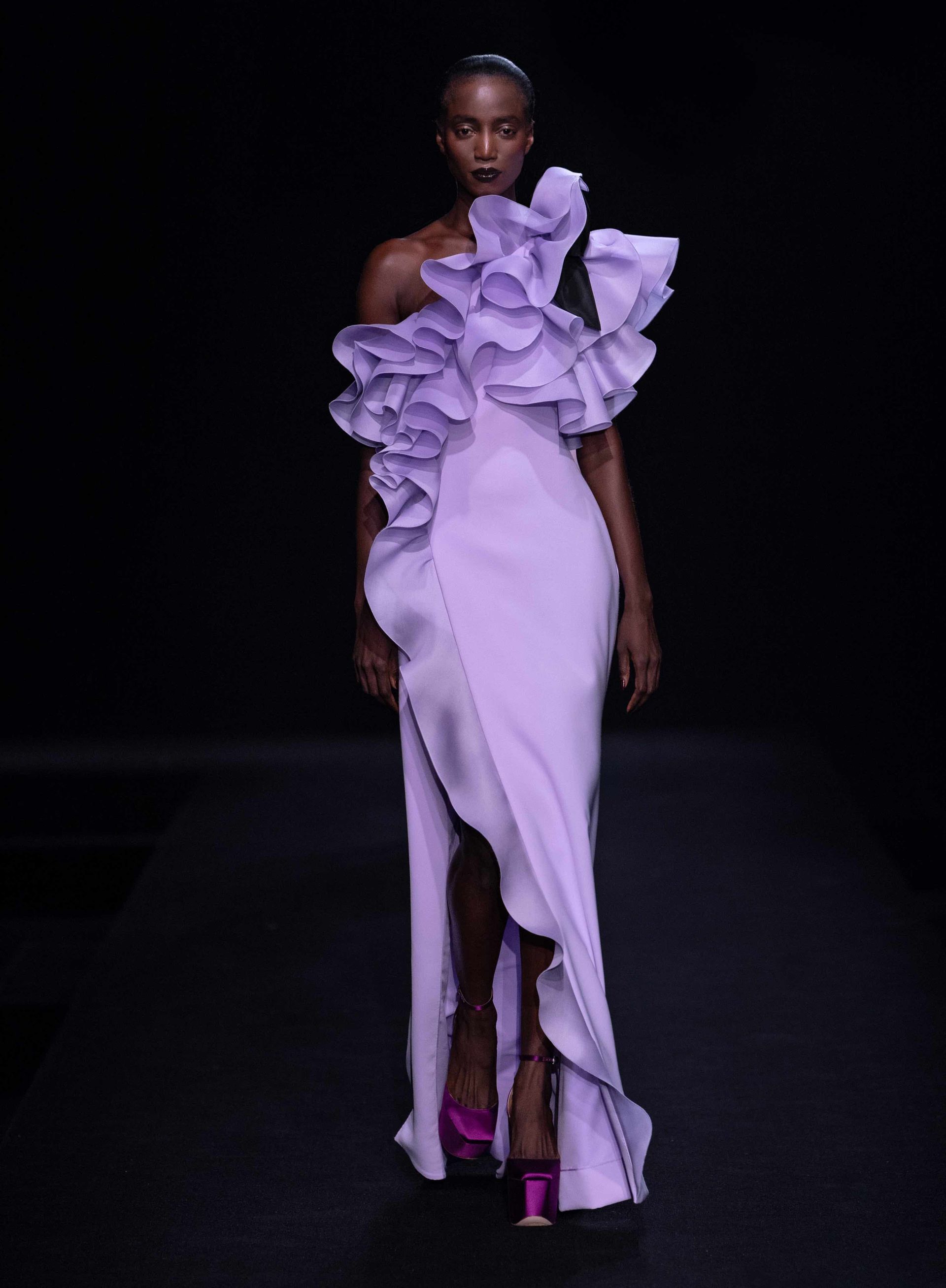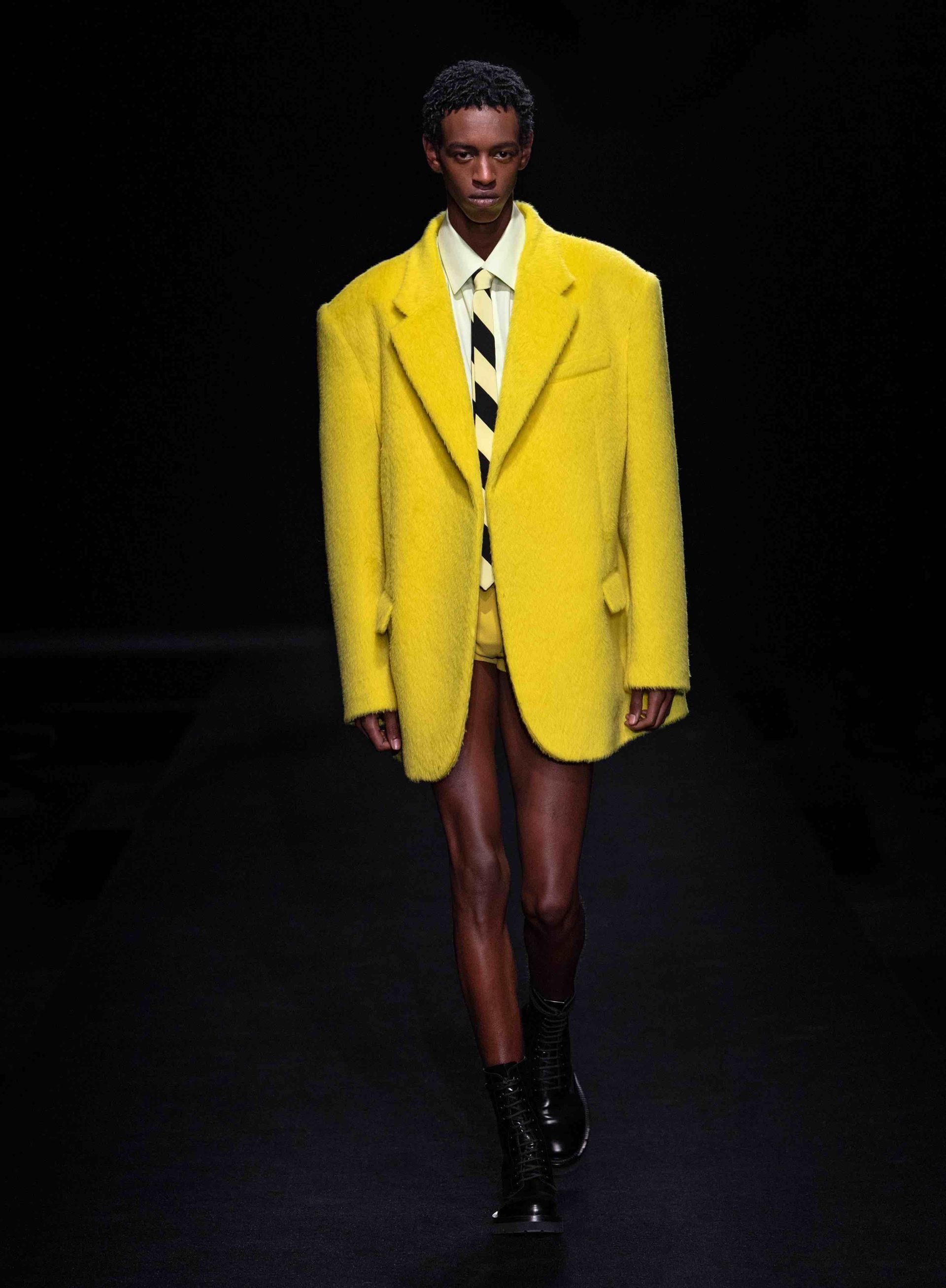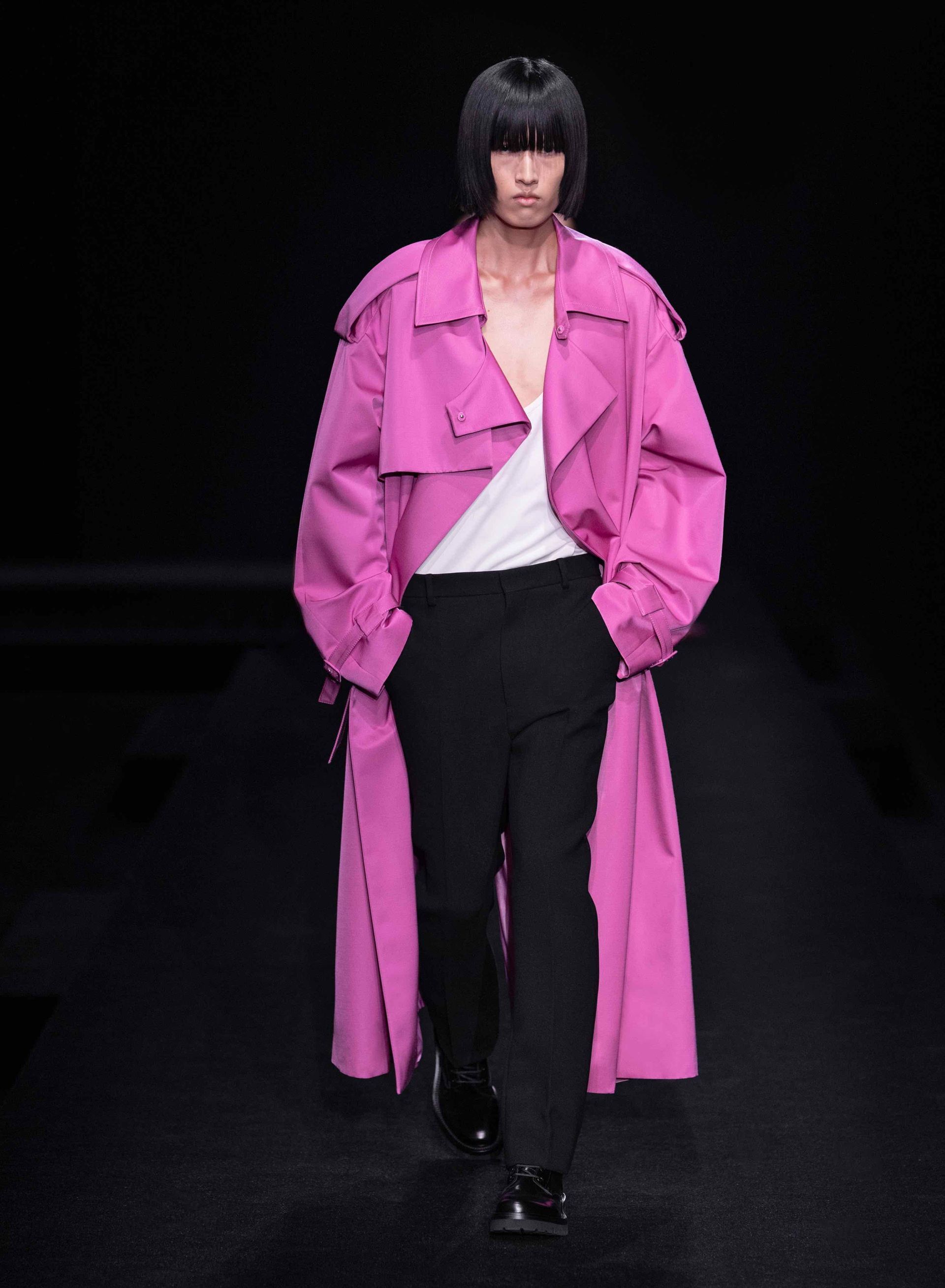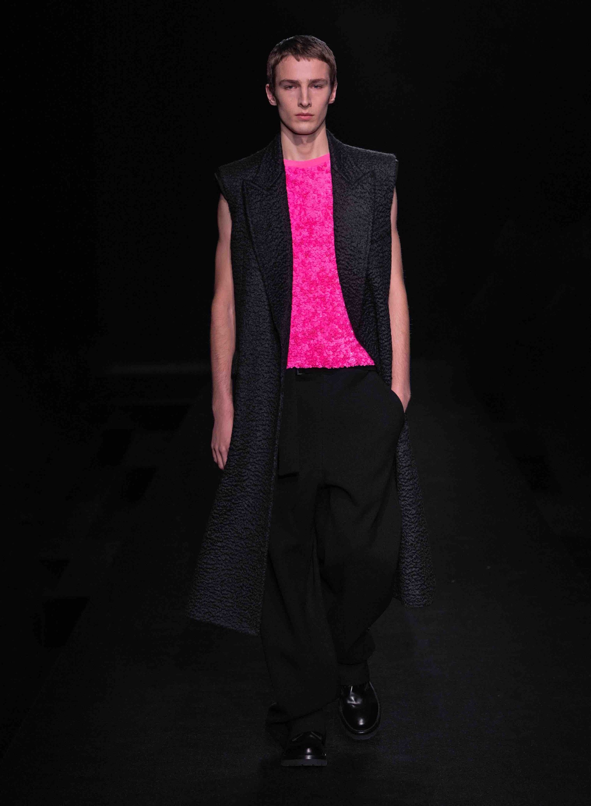 Oversized jackets and trench coats in bright colours like emerald green, blue with oversized sequins or soft in even poudre. Bordeaux-coloured sequin suit blazers, black men's coats with feathers, or plain men's organza blouses. The cuts were reminiscent of the 90s, but seemed contemporary and cool. The absolute highlight was a black men's tulle coat with embroidery.