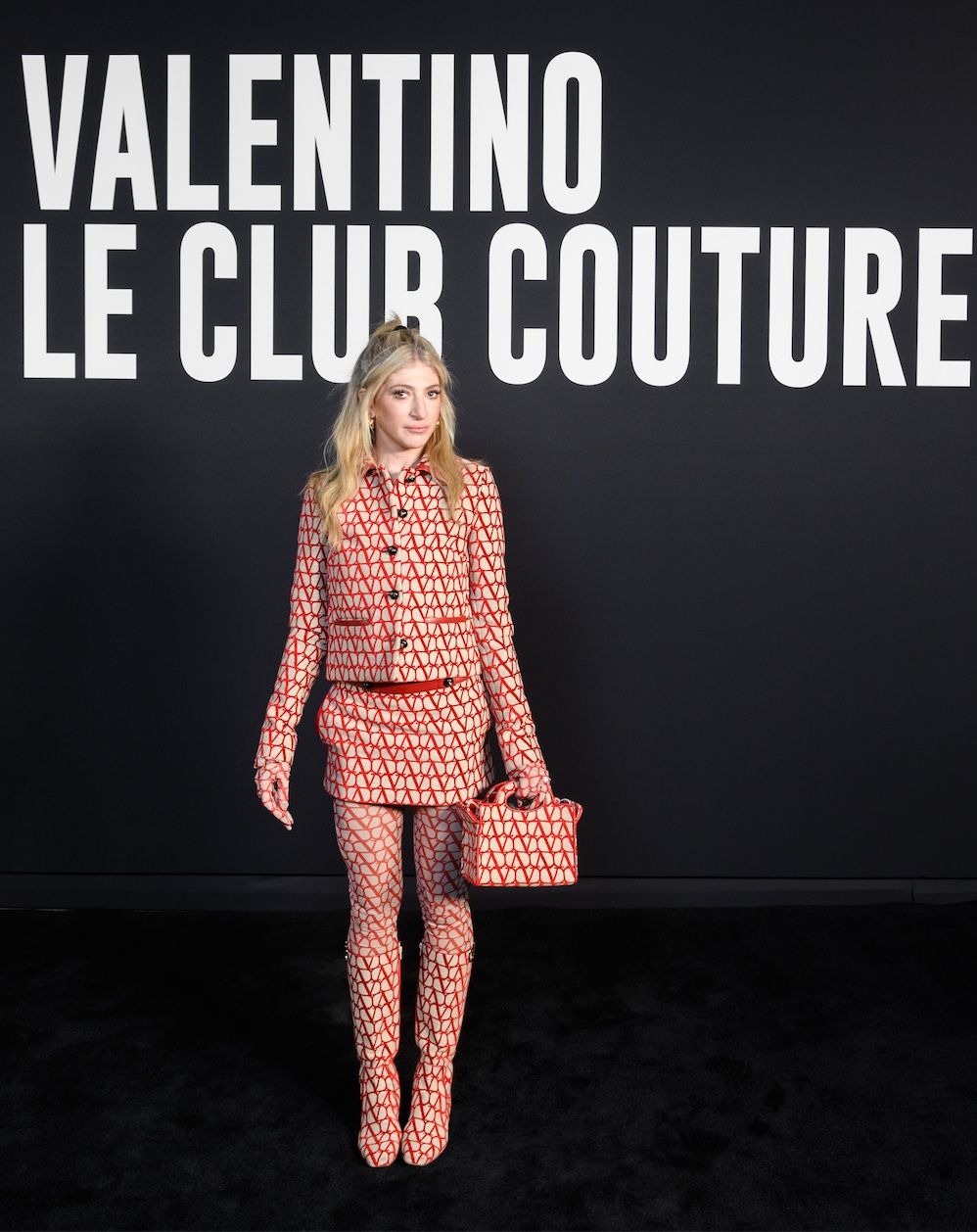 Emmy award winner Dove Cameron wore a red Valentino shirt dress with red 18 cm heel shoes and matching racket with oversized Valentino V logo. Hair and make-up was also matched red. Actress Beatrice Granno wore an oversized shirt and matching tights and bag in the Valentino Toile Iconography look.