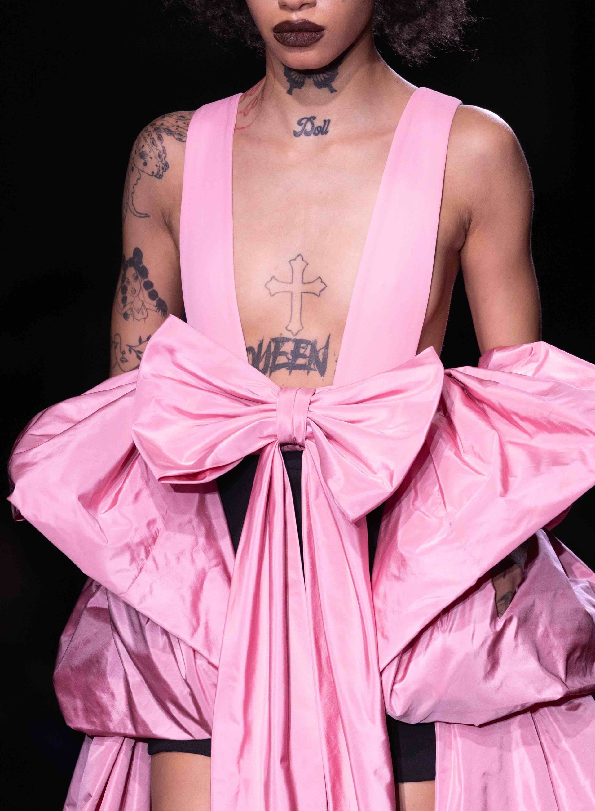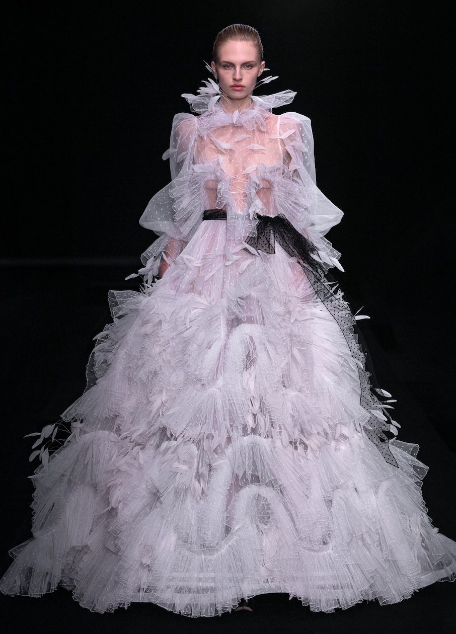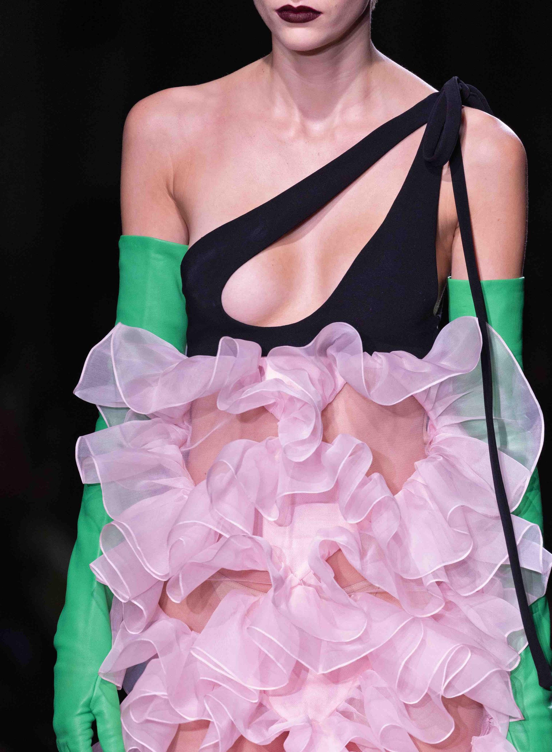 Head designer Pierpaolo Piccioli's mood boards are always highly interesting. Valentino Le Club Couture is inspired by the rich imagery of the club scene and so original tickets from Nirvana, The Plastics or even colourful club flyers from the 80s found their homage in the fashion. The theme of the Pierrot, the lovable tragic character, could be found again in many models. And the 80s staging of Valentino muse Brooke Shields in the legendary pink evening dress with asymmetrical ruffled collar was also to be found in several models.