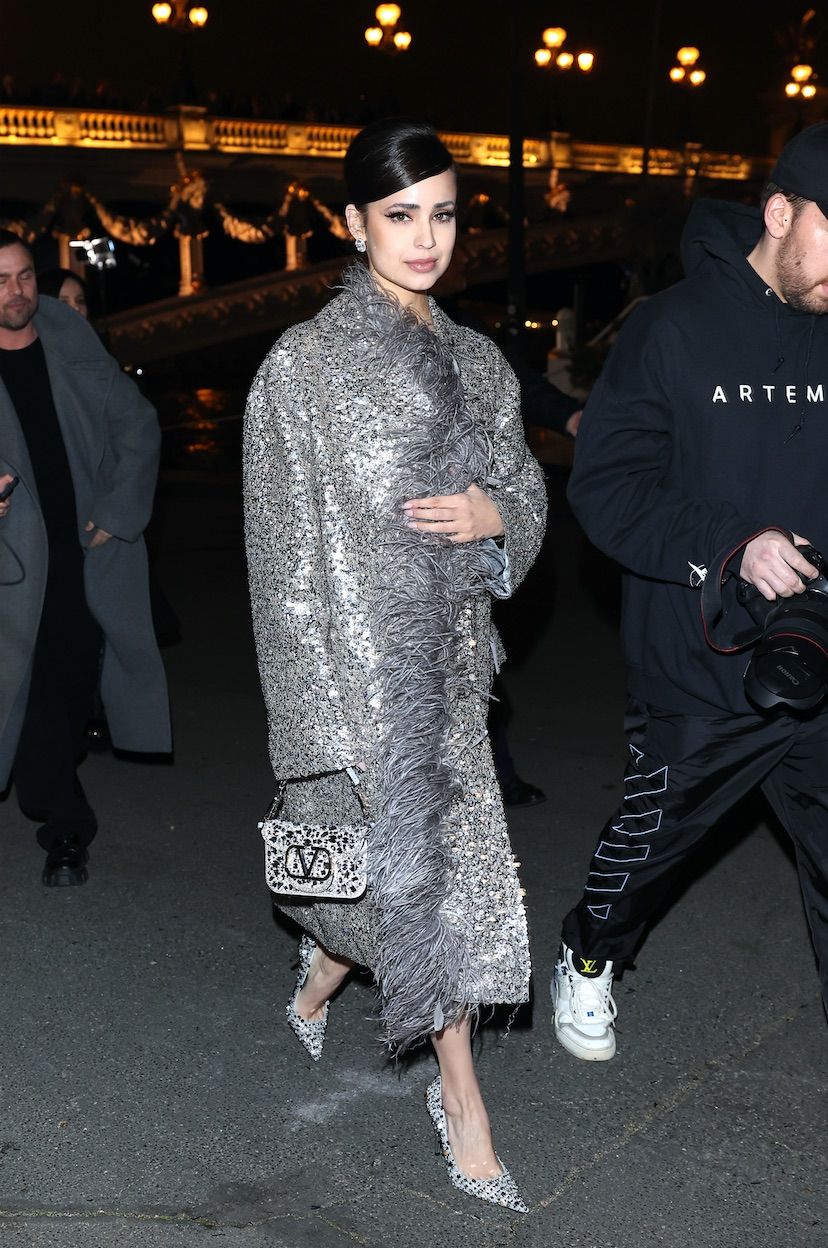 Singer and actress Sofia Carson was also resplendent in monochrome in a grey crystal-trimmed feather coat with matching crystal shoes and v-bag.
