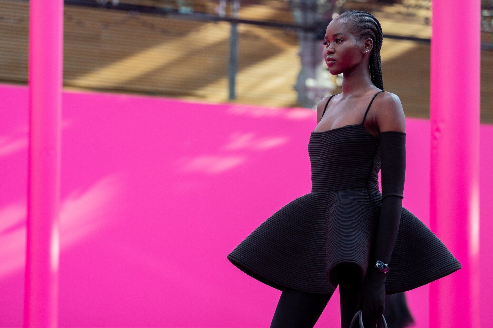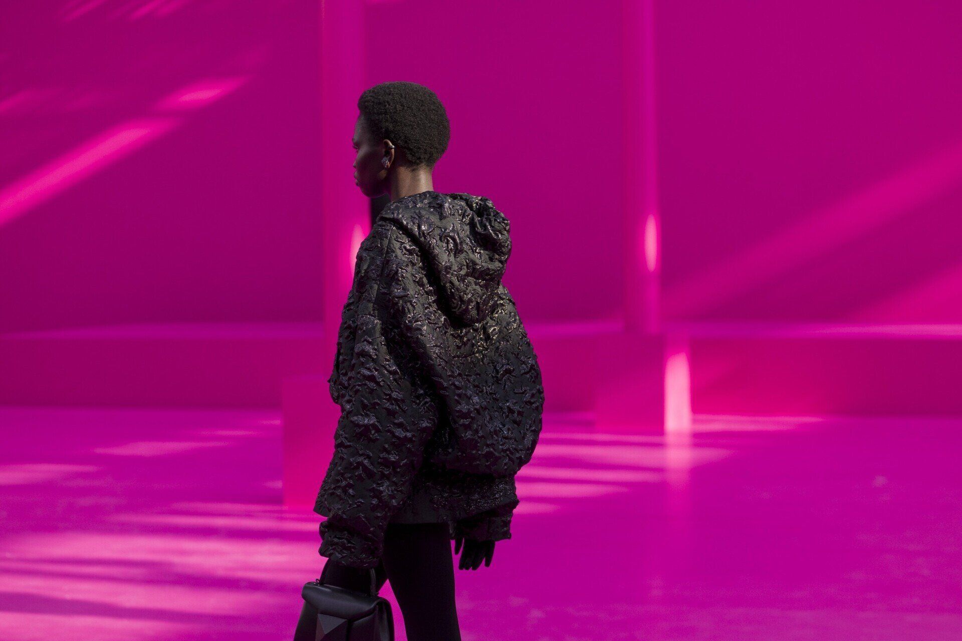 VALENTINO PINK PP COLLECTION AW 22 23 was clear and precise. The cuts presented showed large volumes shaped by geometric folds on the body. Sensual s-shaped lines, very short hemlines, cinched waists. But enhanced with fine Valentino bows, ruffles, petals, lace and embroidery. Pink is associated with traditional notions of femininity, but in the collection Pierpaolo Piccioli used the color in menswear as well.