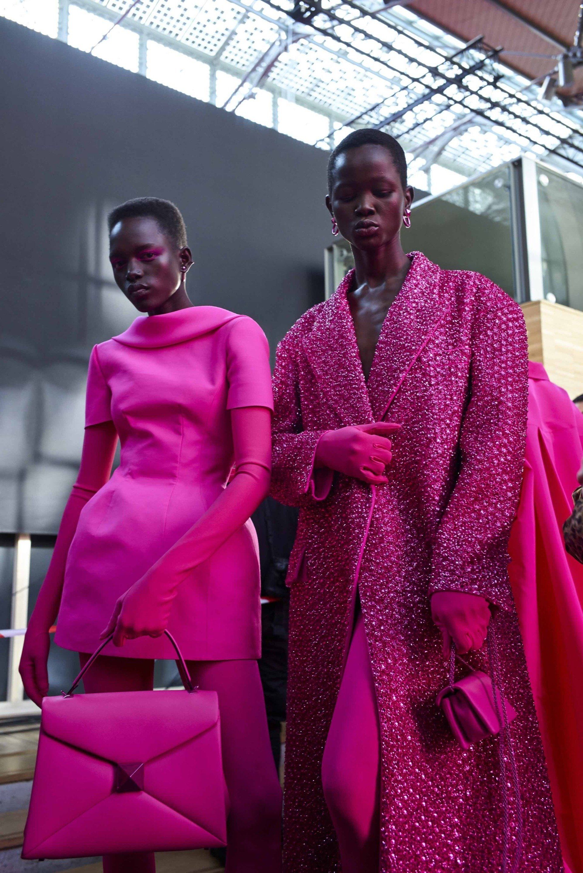 All elements of the backdrop were in the exact same shade and the models walked down a shiny pink catwalk. According to Vogue, Pierpaolo Piccioli decided to do this "to avoid distractions and focus the viewers' eyes on the differences between silhouette and details."