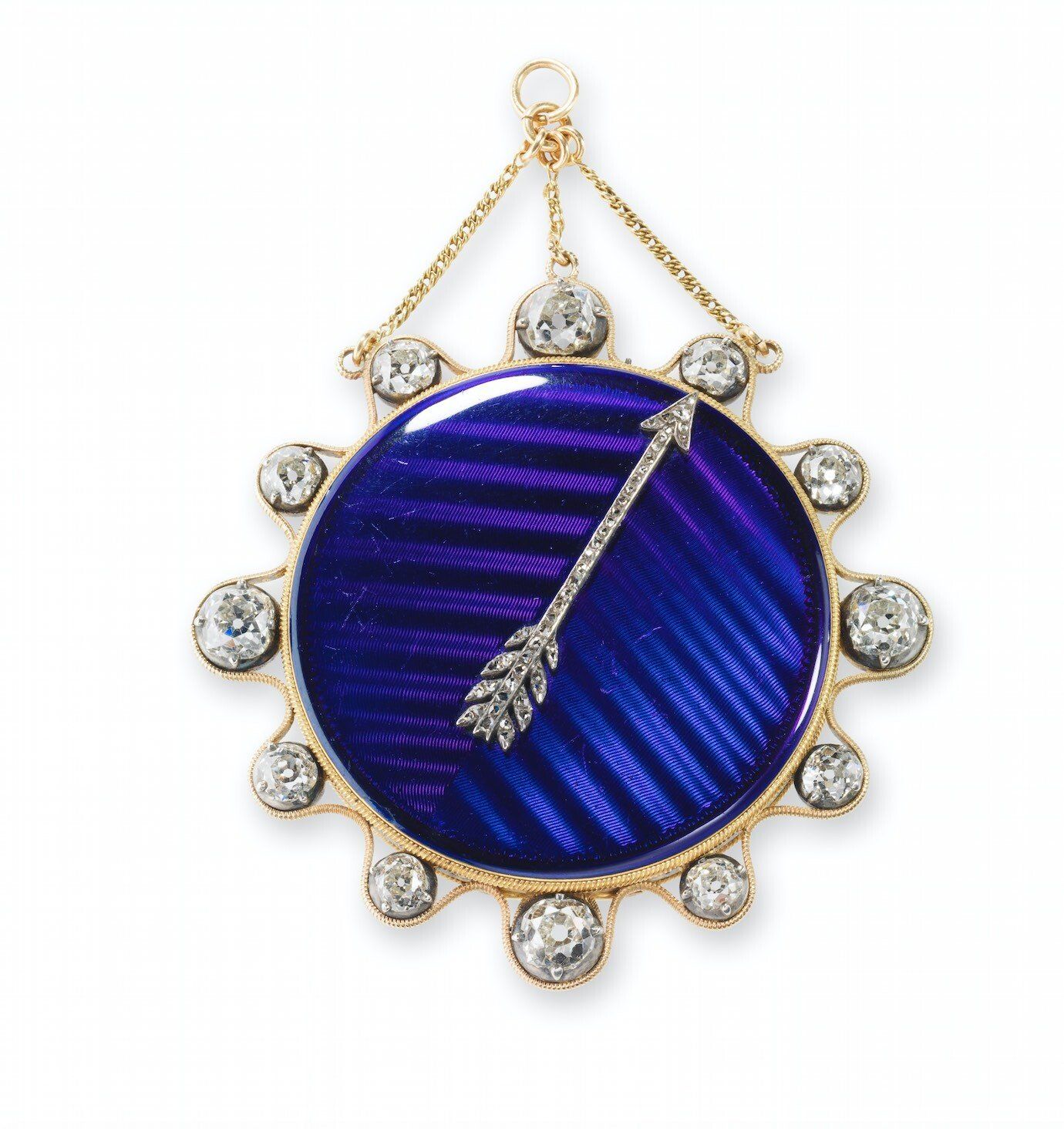 Blue enameled gold case, arrow set with diamonds and key elements of large round diamonds, silver dial, ruby cylinder escapement. Touch watches are equipped with a large outer hour hand, the position of which can be felt in the dark.