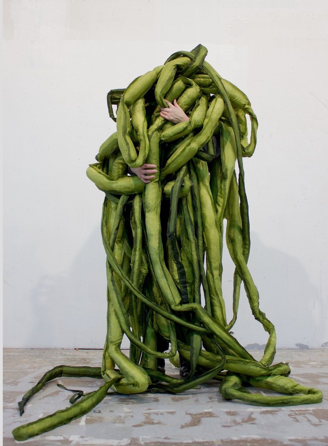 Swedish artist Ingela Ihrman aims to explore the connections between gut and marine flora with A Great Seaweed day: Gut Weed (2019). The dyed silk is based on Ulva Intestinalis - an algae known as "mermaid's necklace" or "gut weed."