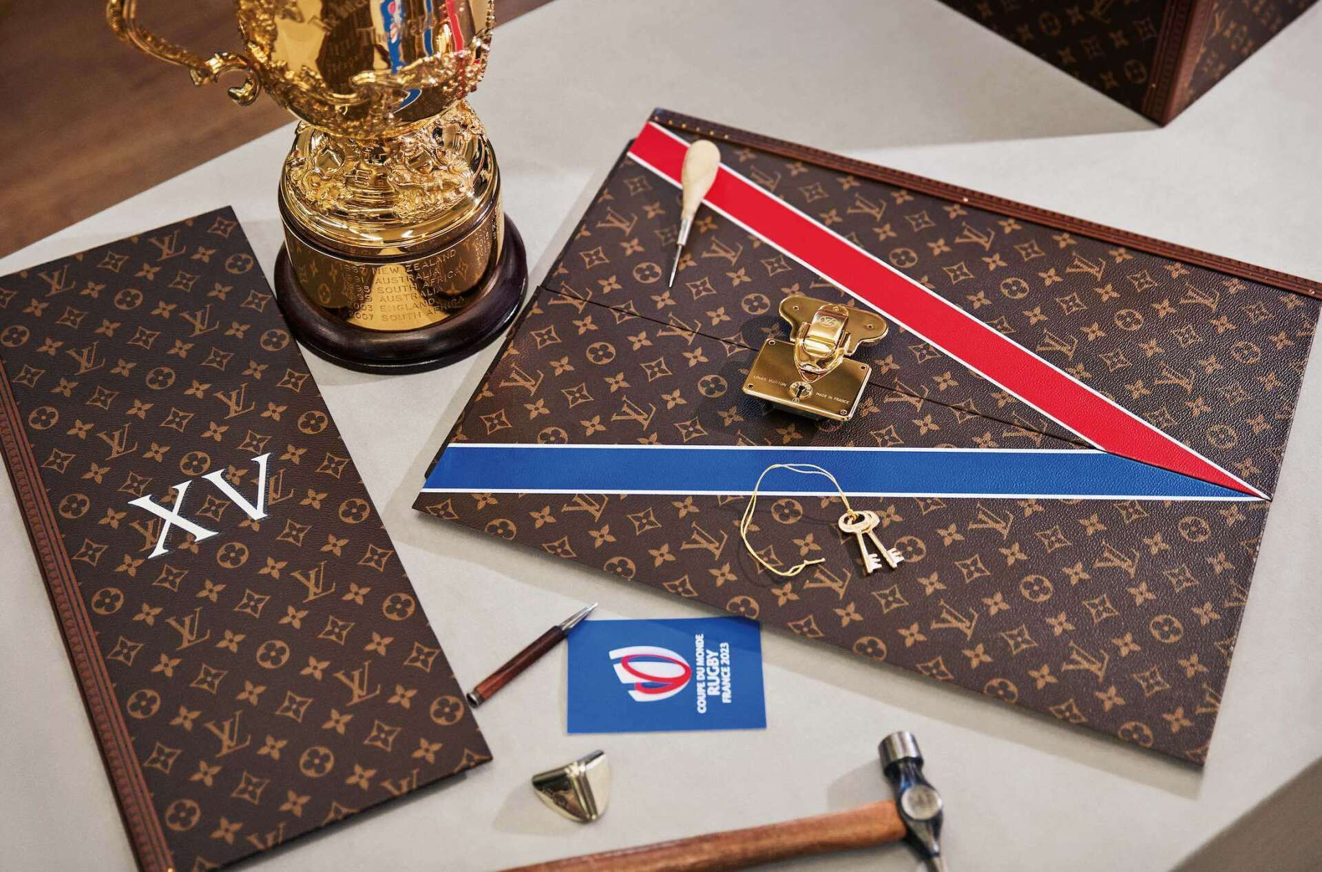 The official Louis Vuitton trophy travel case designed to showcase the Webb Ellis Cup at the 2023 Rugby World Cup in France.