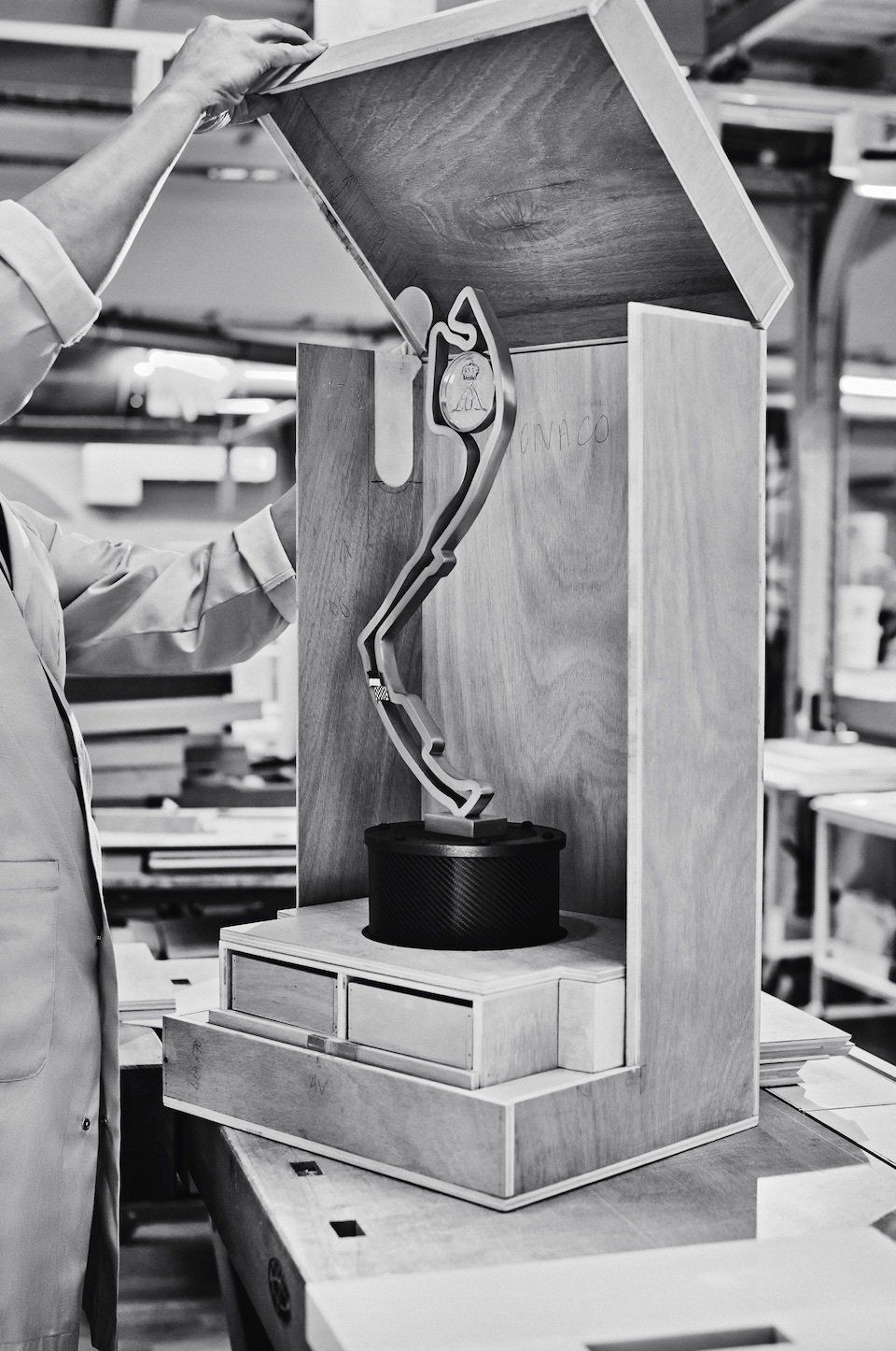 The 2021 Louis Vuitton trunk for the Formula 1 Grand Prix trophy, manufactured at the Louis Vuitton workshop in Asnières-sur-Seine.