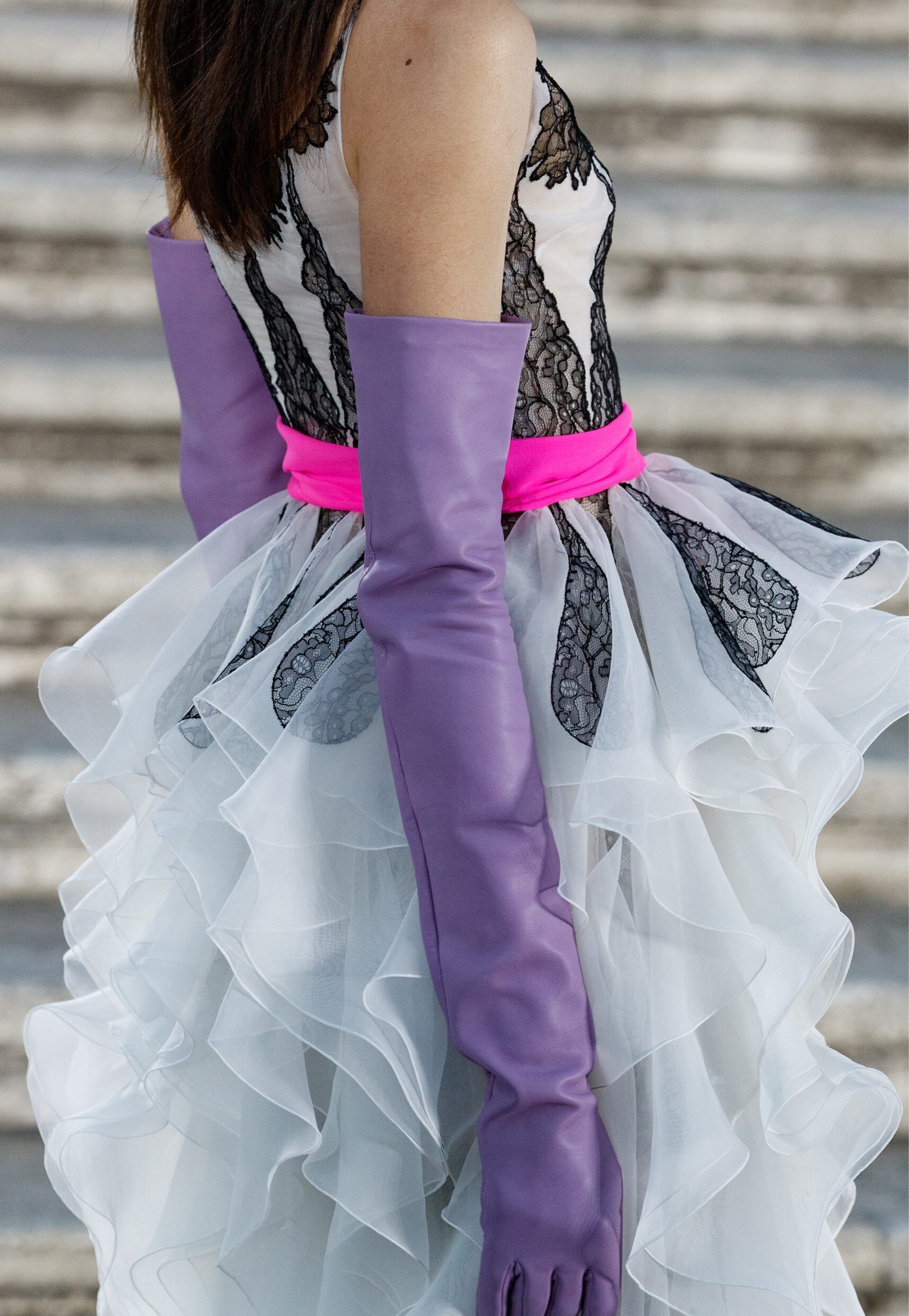 Contrasting colours were combined in one model, but the colour contrast harmonised with classic black or shades of white or grey. Ultra-feminine elements such as black lace or a red rose appeared sporadically. Or long leather gloves were shown, even in red.