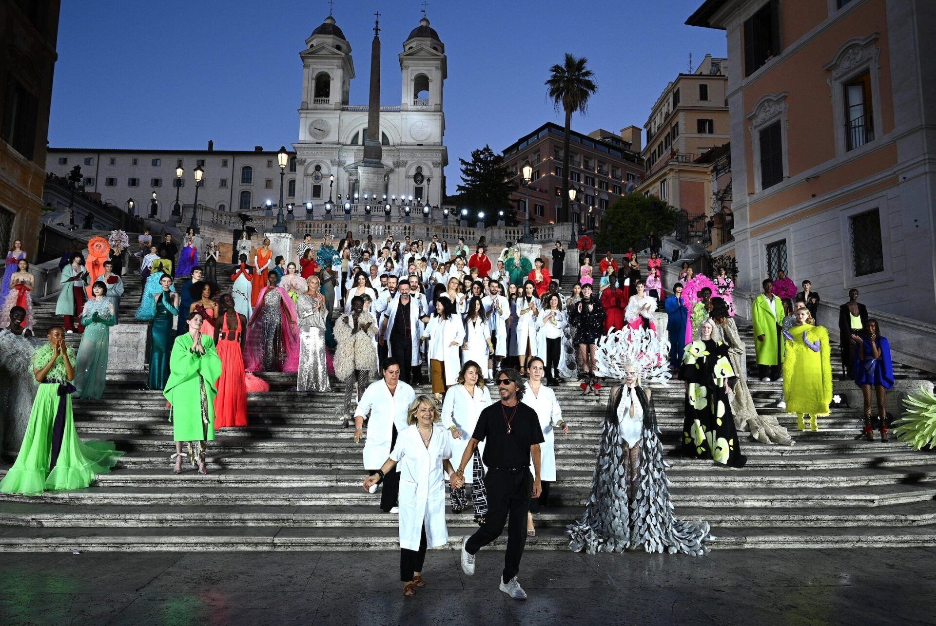 Die Location der Spanischen Treppe war perfekt gewählt, die grauen historischen Stufen waren ein schöner Kontrast zu kaleidoskopartigen Farben, die die Liebe des Designers zu Lebensfreude, Licht, Harmonie und Diversität zeigen.