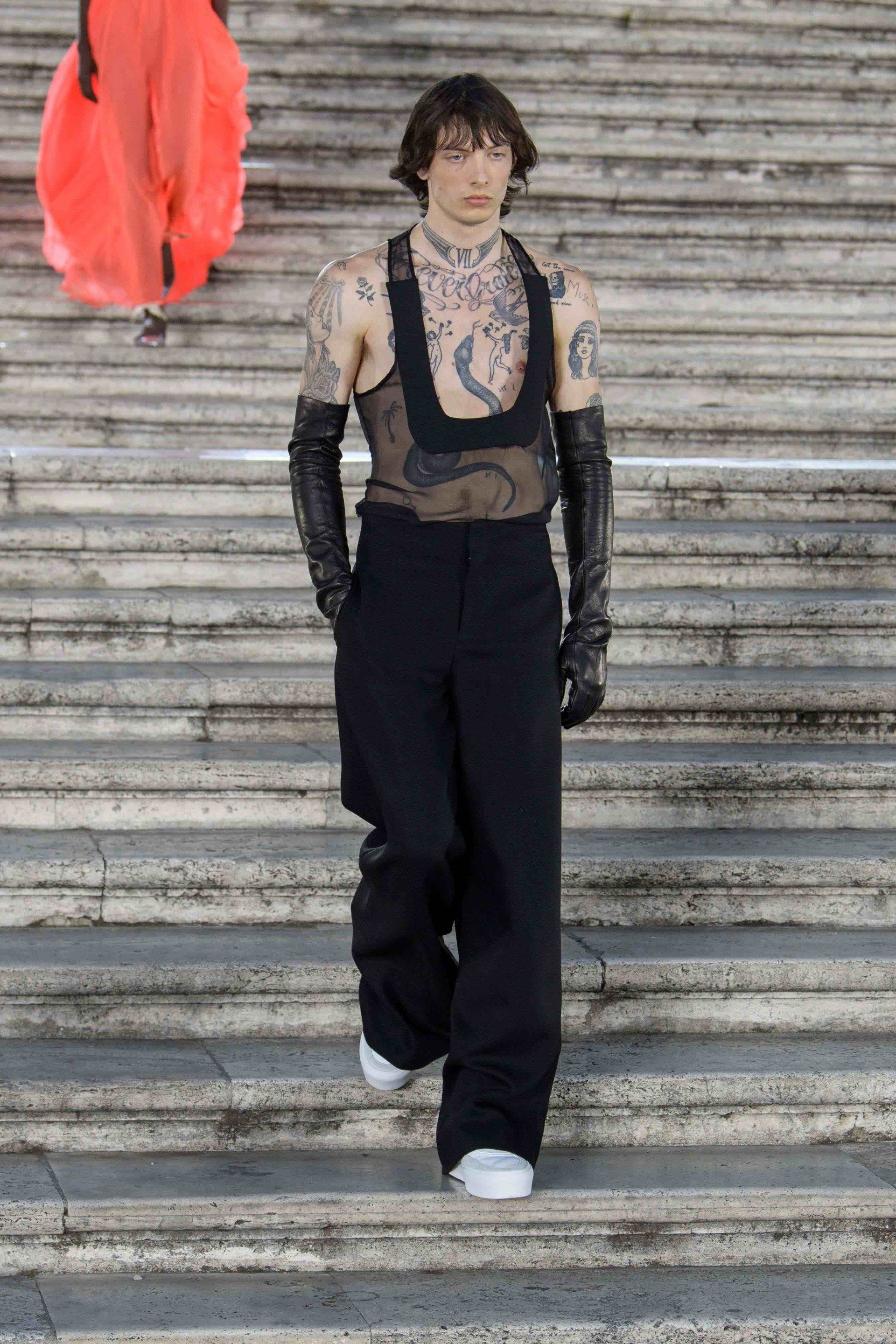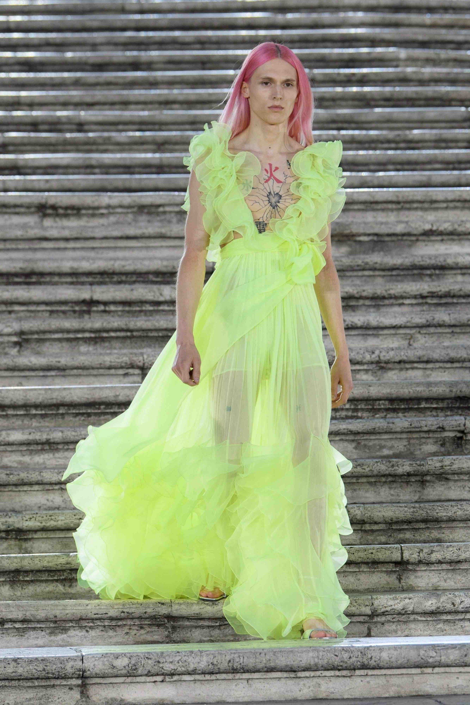 Bei Pierpaolo Piccioli's Mode vermischen sich immer mehr die Grenzen zu den Geschlechtern und so trugen Herren Chiffonkleider und Bustiers.