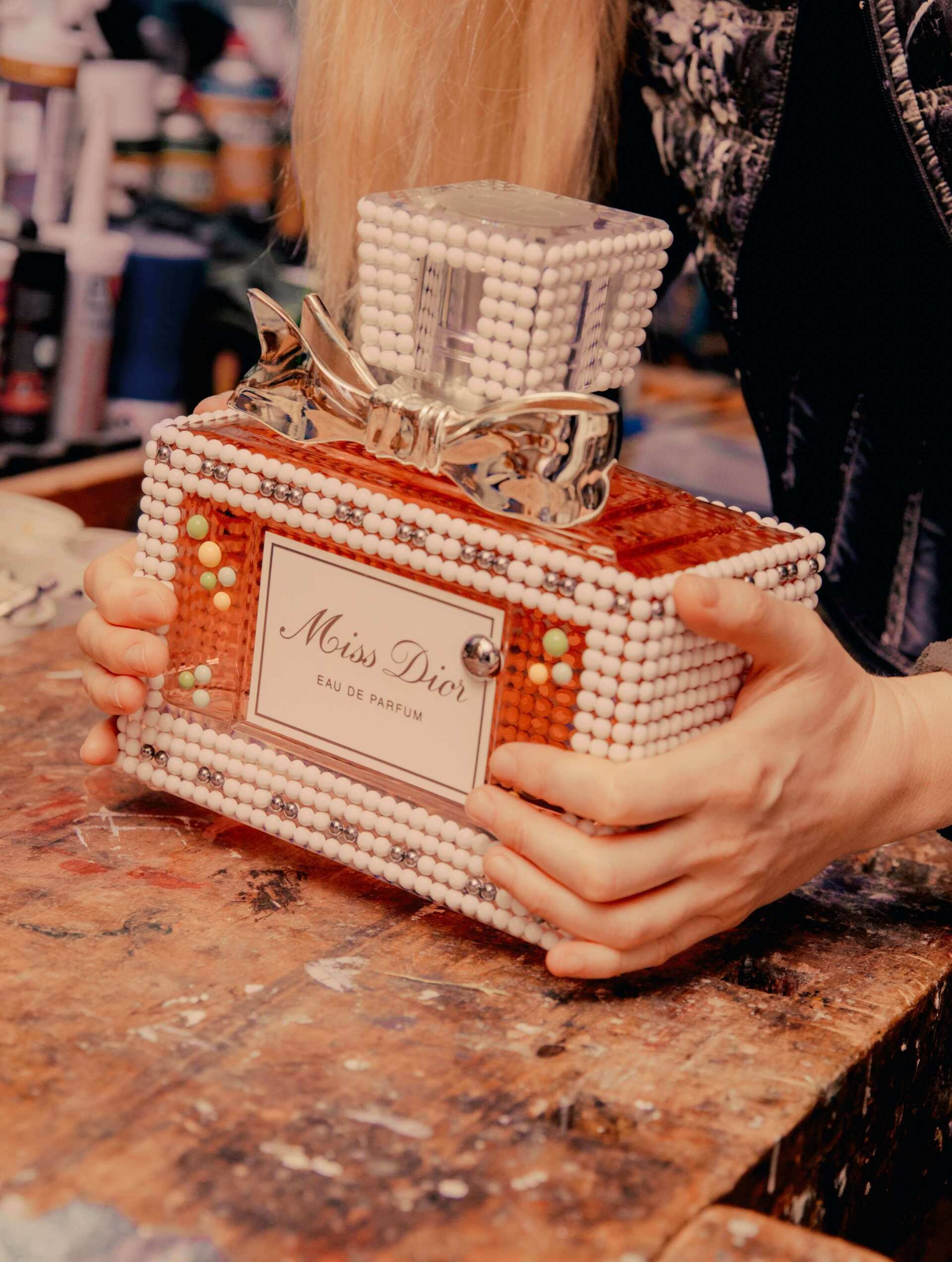 The two sculptures by Pia Maria Raeder symbolise the brother and sister Catherine and Christian Dior. A sculpture in the silhouette of a dress embraces the Miss Dior flacon, also worked on, with the wooden stick elements typical of her work. Both sculptures bear the characteristic Dior bow. The artist has applied pink, pink, green and yellow to the tips of the wooden sticks, giving the impression of a floral dress.