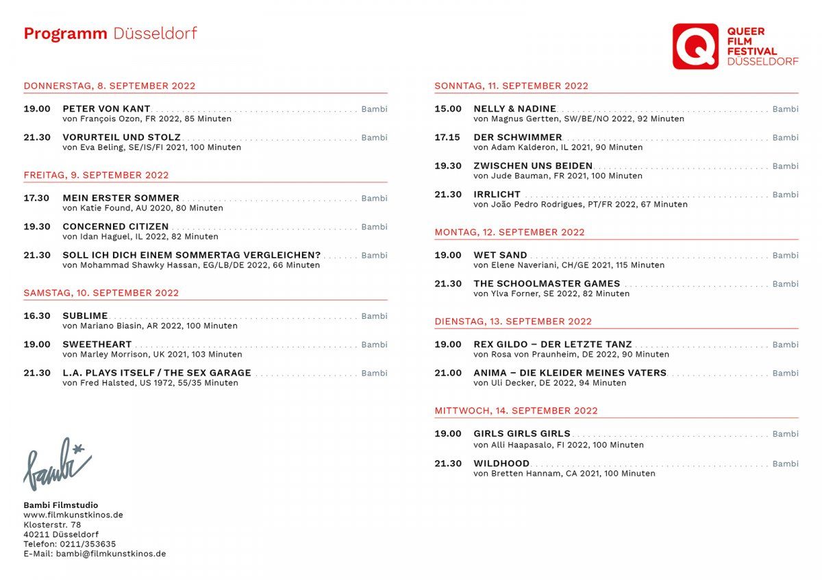 Düsseldorf, 5 September 2022: The Queerfilmfestival celebrates the best queer films of the year for a whole week this September. From Thursday 8 September to Wednesday 14 September, 19 non-heteronormative feature films and documentaries will be screened in 13 cities - Berlin, Dresden, Düsseldorf, Frankfurt am Main, Fürstenwalde, Halle (Saale), Cologne, Leipzig, Magdeburg, Munich, Nuremberg, Stuttgart and Vienna. The programme includes highlights from Cannes, Toronto, Locarno and the Berlinale. With a few exceptions, the films are German premieres. In Düsseldorf, the Queer Film Festival takes place at the Bambi Kino.