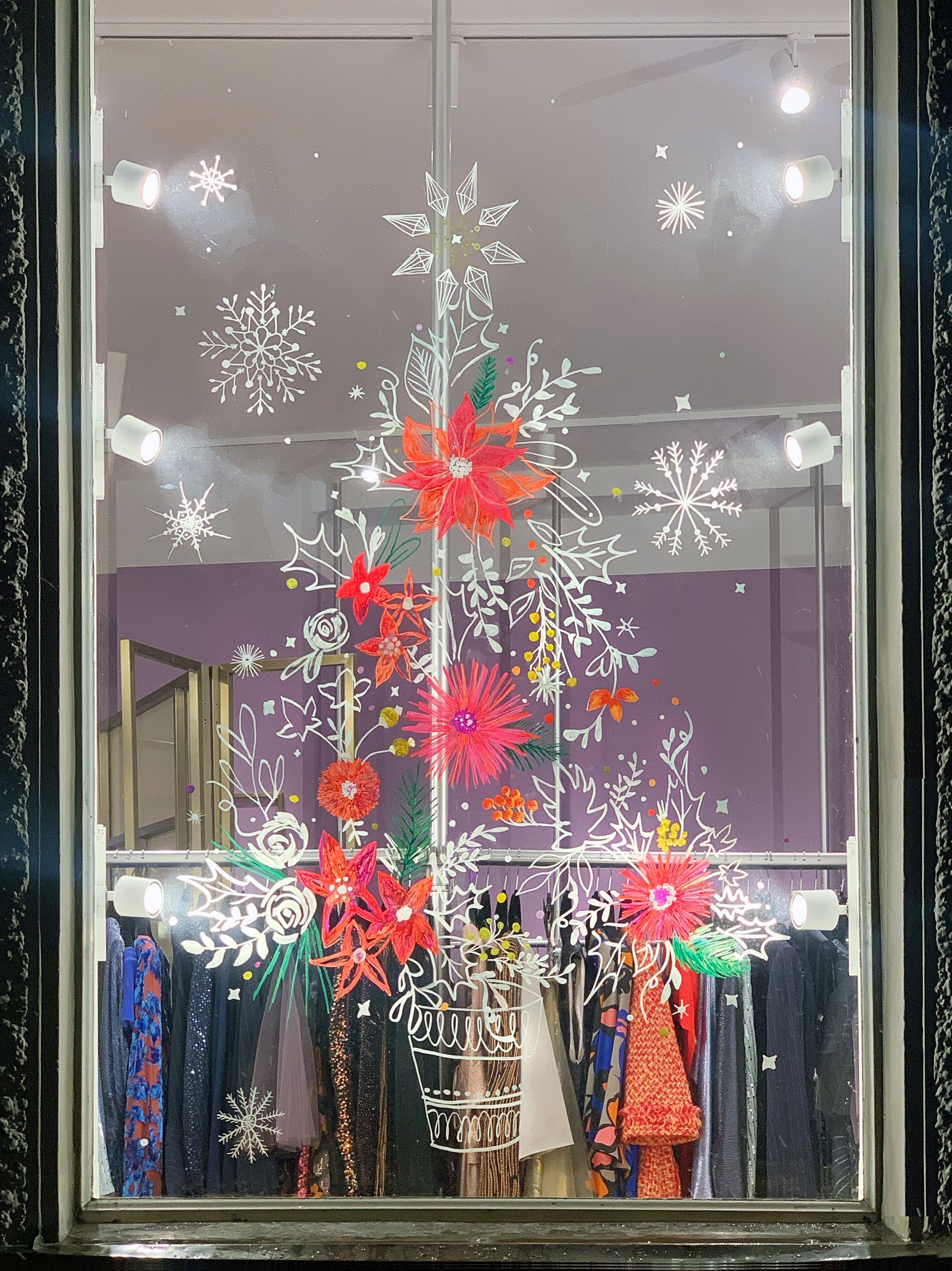 Allis Bergstrand, illustrator and graphic designer from Sweden, is responsible for the Talbot Runhof boutique in Berlin. She now lives in Berlin. The shop windows in Schlüterstraße were decorated with Christmas motifs in a cartoon-like style - from presents to snowflakes, in shades of gold and purple. Here, too, the motifs were painted by hand.