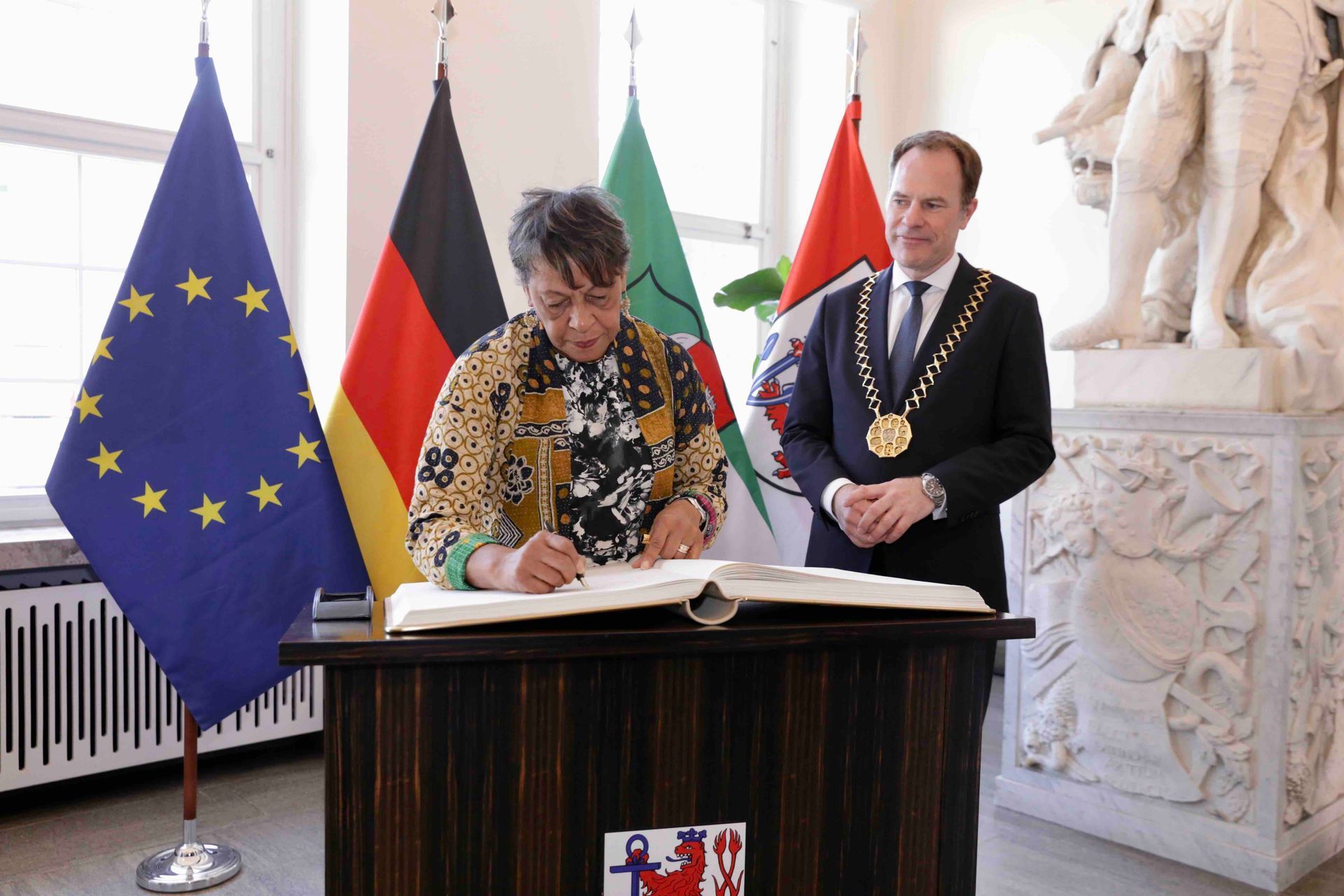The main prize winner Carrie Mae Weems and the sponsorship prize winner Hannah Darabi were welcomed in the afternoon by Lord Mayor Dr Stephan Keller in the City Hall and Carrie Mae Weems signed the Golden Book of the City of Düsseldorf. The city was represented by Lord Mayor Dr Stephan Keller, Commissioner Miriam Koch and Mayor Clara Gerlach. The art world was represented in large numbers, including the director of the Kunstpalast, Dr Felix Krämer and the artists Andreas Gursky and Katharina Sieverding. But numerous Düsseldorf gallery owners and curators were also present. Tony Cragg and Prof. Dr. Robert Fleck were the hosts. Afterwards, there was an exuberant party on the grounds in front of the Eiskellerberg Galerie.