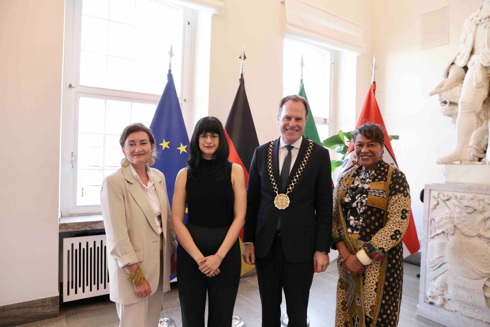 At the reception in the Düsseldorf townhall (from left to right): Councillor for Culture and Integration Miriam Koch, Hannah Darabi, Lord Mayor Dr Stephan Keller, Carrie Mae Weems. © State Capital Düsseldorf/Ingo Lammert