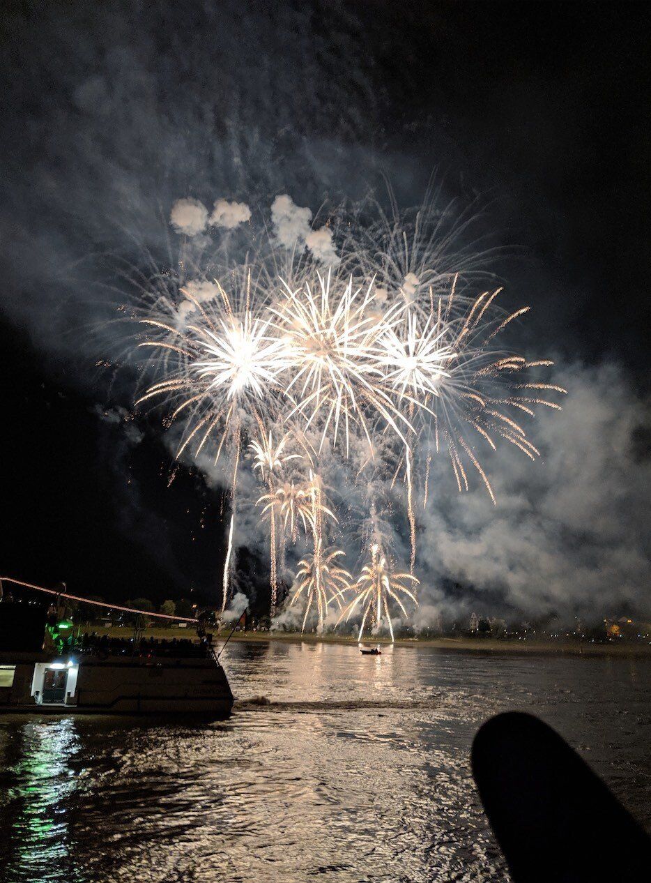 The large funfair town is set up every year on the Rhine meadows in Oberkassel, where sheep usually graze. On the 165,000 square metres of fairgrounds, over hundreds of showmen present a wide range of rides. In 2023, the over 700-year-old St. Sebastianus Schützenverein with its more than 1,500 marksmen will celebrate the name day of its patron saint St. Apollinaris, 23 July. The "Historic Procession" will take place on 16 July. With more than 3,000 uniformed marksmen and bands, it is one of the largest in Germany. The big Kirmes fireworks display will take place on the last Kirmes Friday, 21 July 2023.