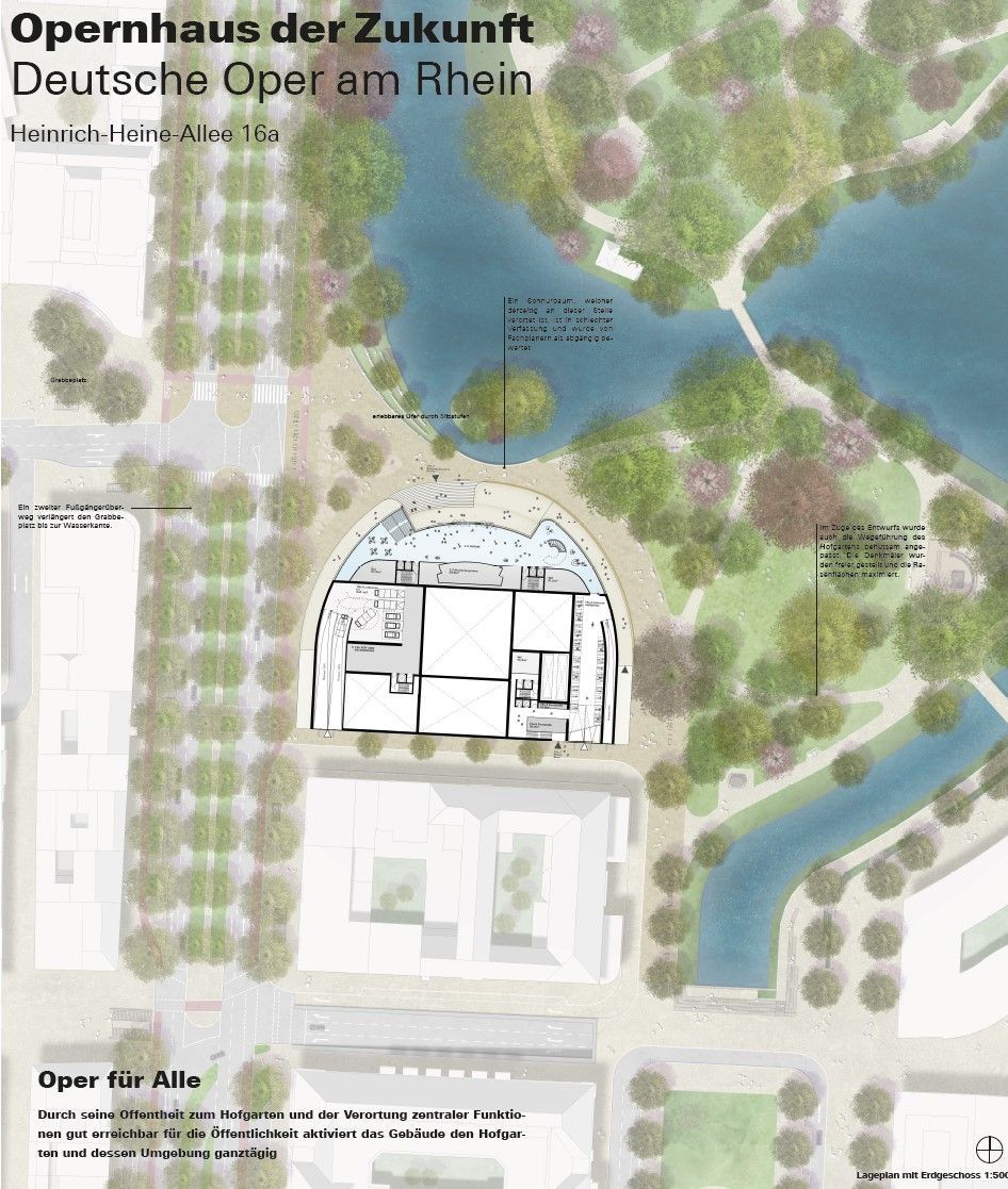 The location was recommended on the basis of the results of the urban planning ideas competition. The jury of the competition for the Opera House of the Future had awarded prizes to seven urban planning works. For the two possible locations - Heinrich-Heine-Allee and Am Wehrhahn - four and three designs respectively were awarded prizes.