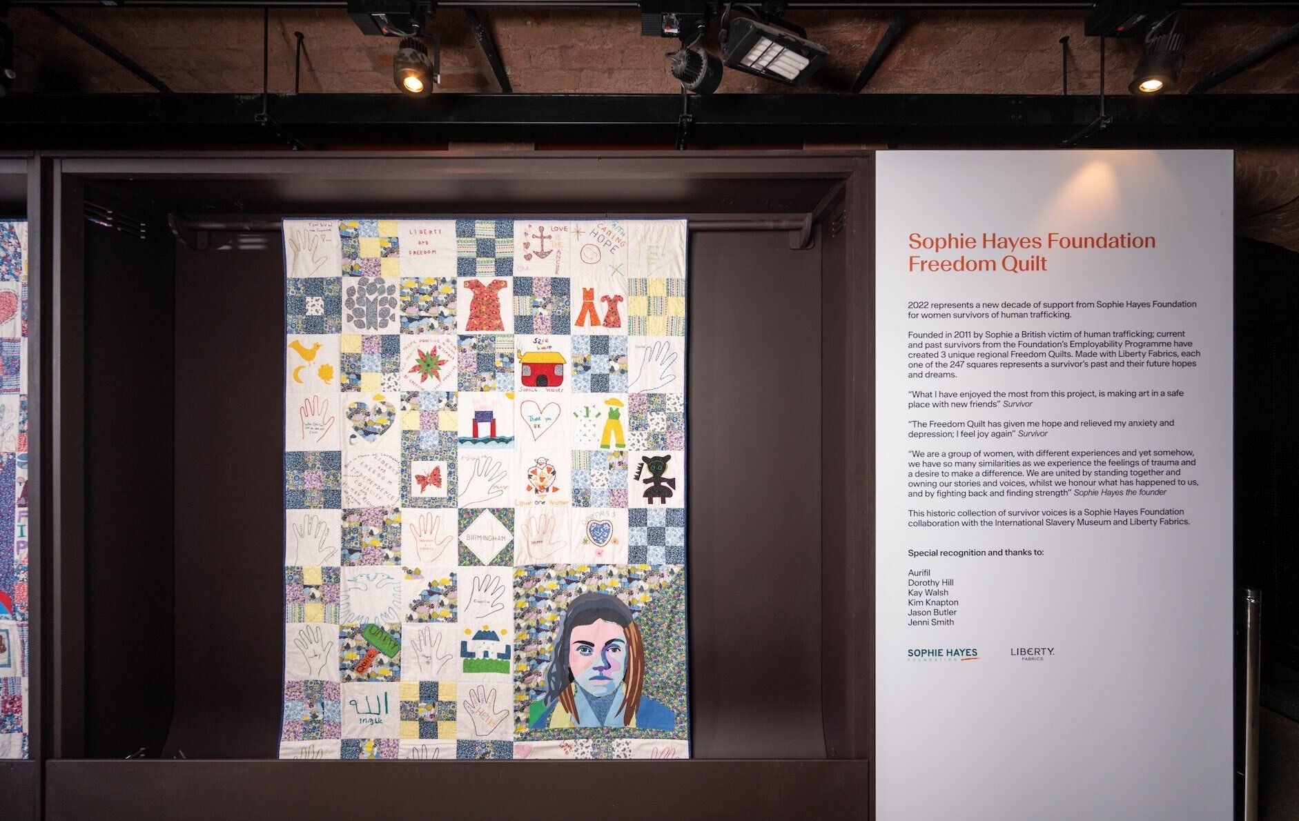 Red Godfrey-Sagoo: In 2021 the Foundation was Liberty's charity partner receiving donations from customers etc. However, for December 2021 the Foundation was considering an in-person event to mark 10 years of supporting survivors of human trafficking. However, due to COVID it was difficult to plan or schedule anything, so we went to Liberty and asked if there were any creative collaborations that survivors and Liberty could work on to celebrate the anniversary. The result of this conversation was Liberty's offer of fabrics and the idea of a quilt made by survivors was born. At the time we did not imagine it would become such a historically valuable piece of artwork and it would be housed at the International Slavery Museum, more poignant as Sophie Hayes herself was from the north not far from Liverpool.