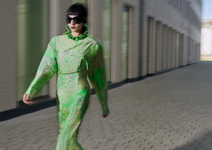 The street style collection exudes a "see-and-be-seen" attitude. From avant-garde interpretations of lace-up denim and one-size-fits-all suits to lime green satin combinations and a leopard print swimsuit. A studded denim miniskirt, ruffle-trimmed mesh top and rhinestone-studded little black dress evoke the excess of the late 1990s. Accessories also focus on statement pieces, from green snake earrings to studded platform clogs and red western boots.
