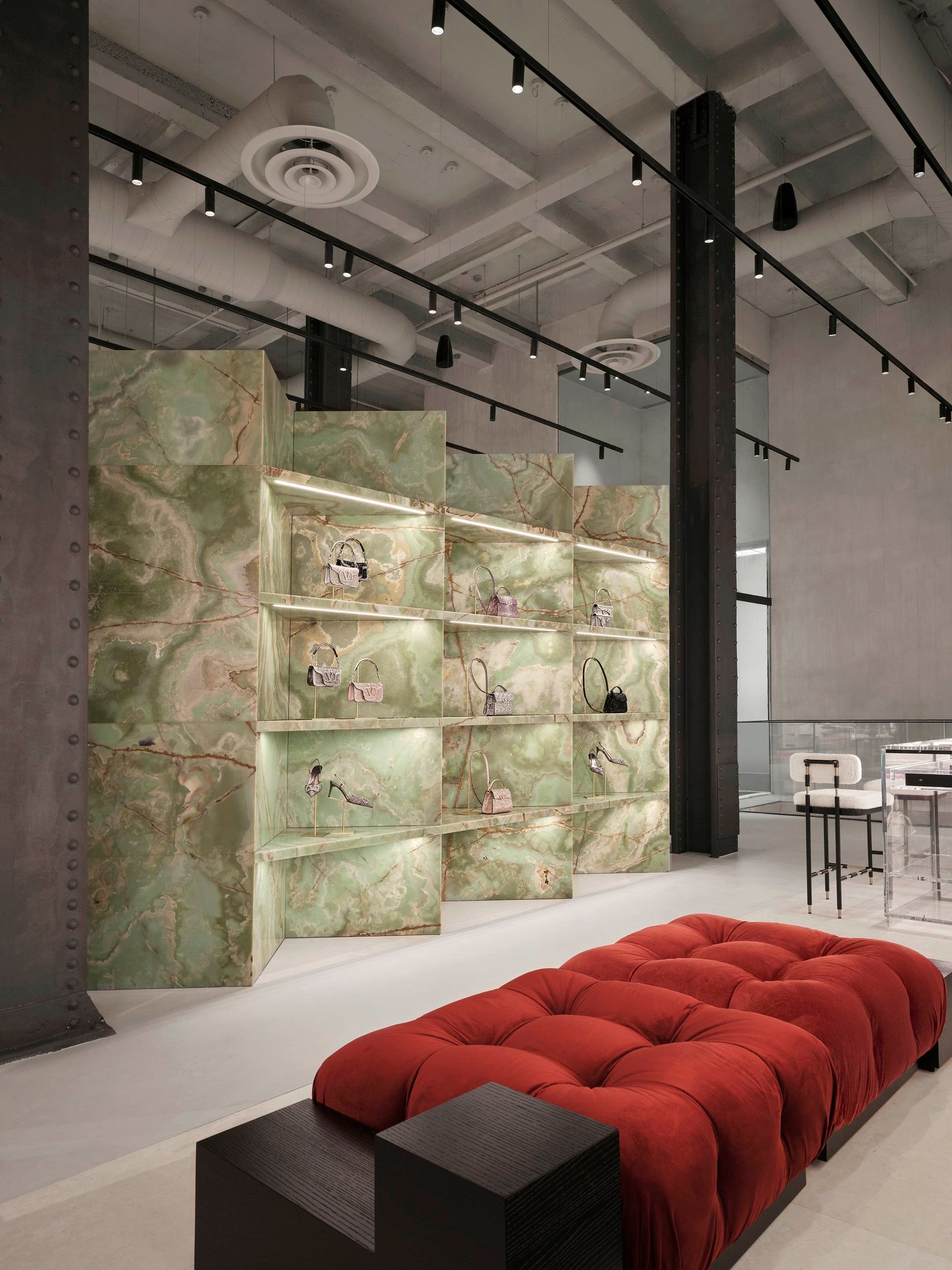 Customers enter the shop through a pair of large double doors with sculptural marble handles modelled by ceramist Massimiliano Pipolo. Inside, the monumental character of the building is revealed with seven metre high ceilings, exposed steel columns and a rough concrete surface punctuated by illuminated shelves for Valentino Garavani accessories. In the centre of the space is a green onyx display unit.
