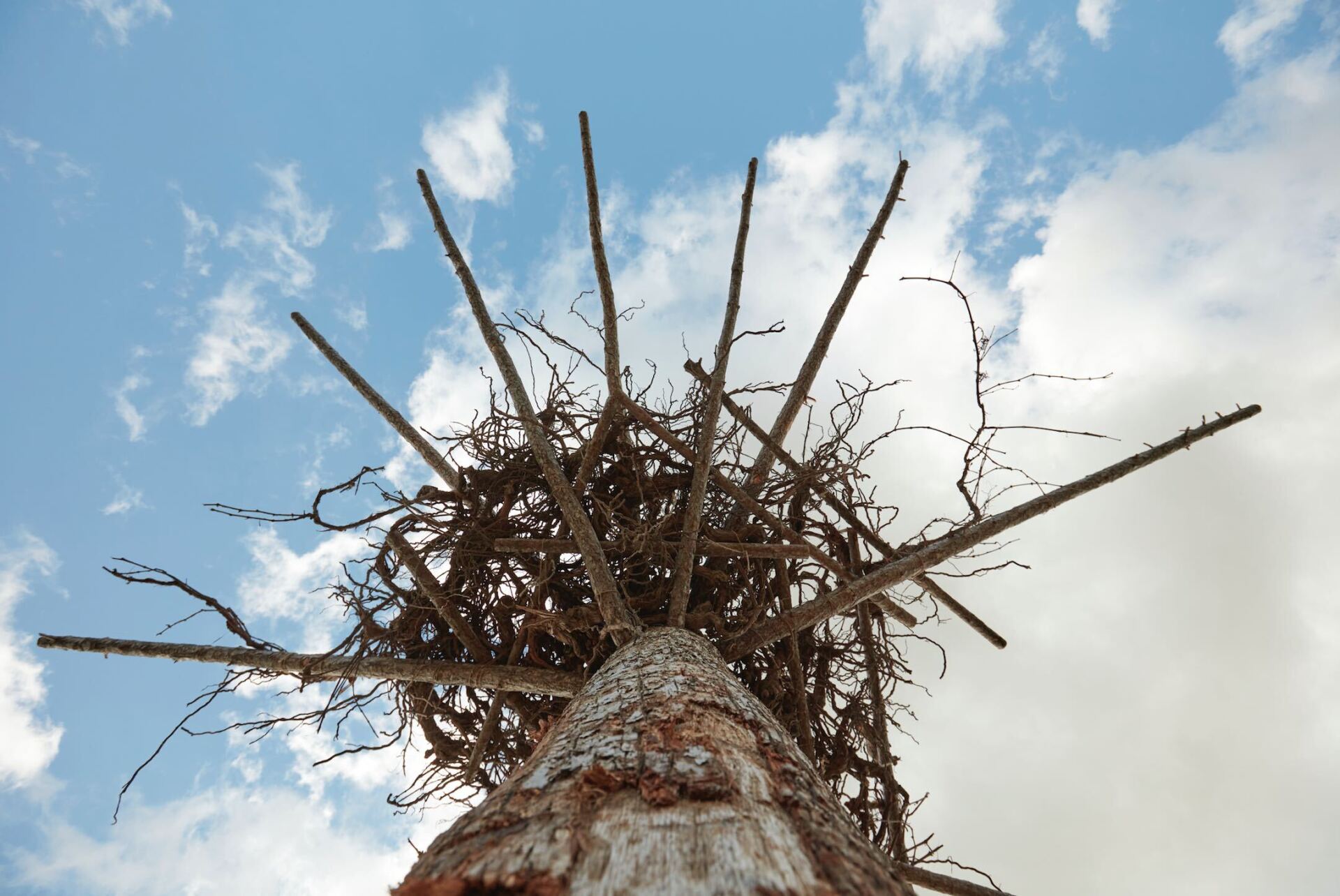 Nils-Udo verwendete ausschliesslich Rebstöcke und Triebe aus dem Weinberg. Die fächerförmig angeordneten Nadelbäume bilden mit ihren drei Meter hohen Stämmen einen Schirm, der mit einem Nest aus Trieben besetzt ist. Diese HABITATS sind in der Erde verankert und enthalten keine Nägel oder Metallbefestigungen.