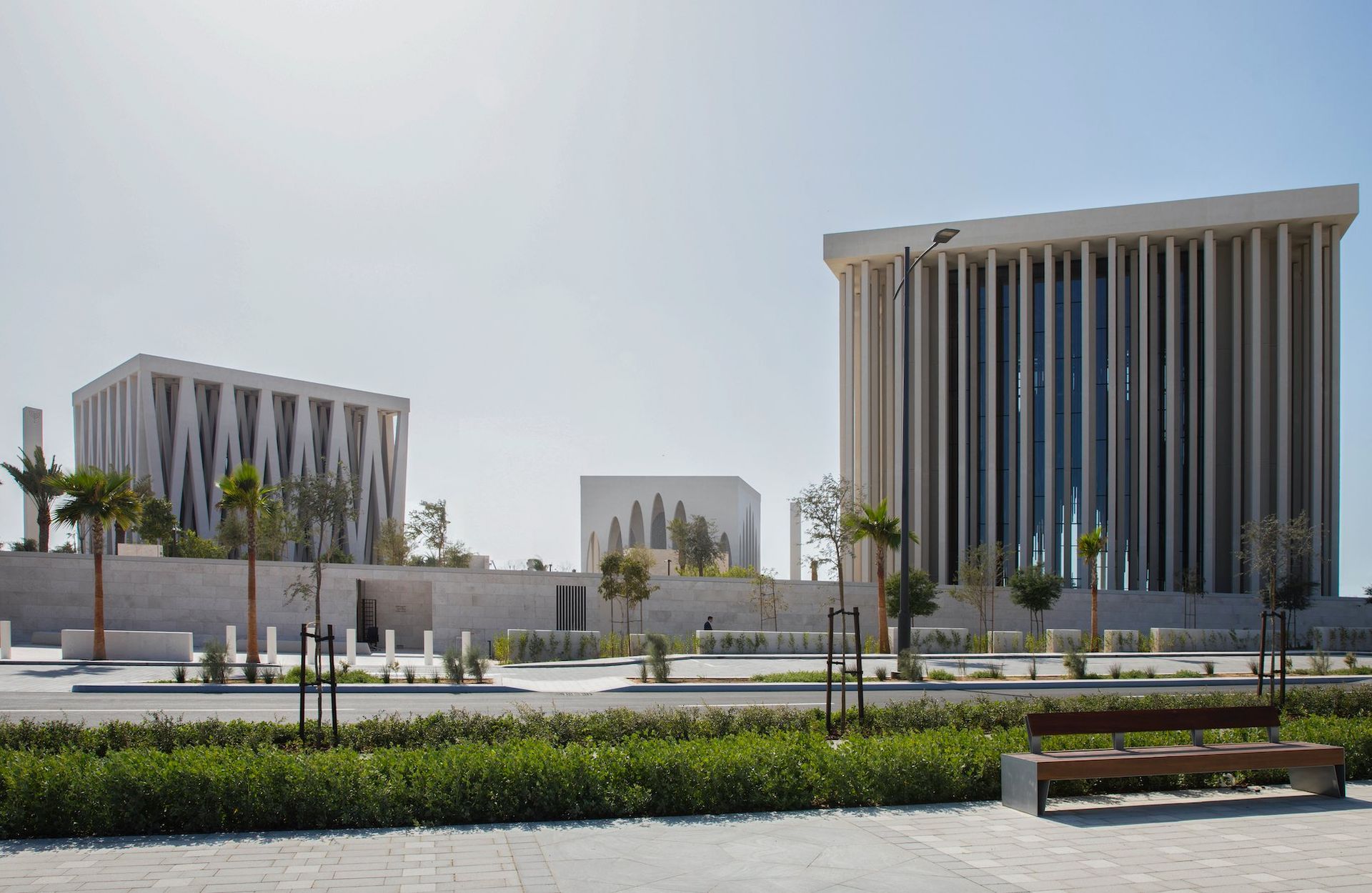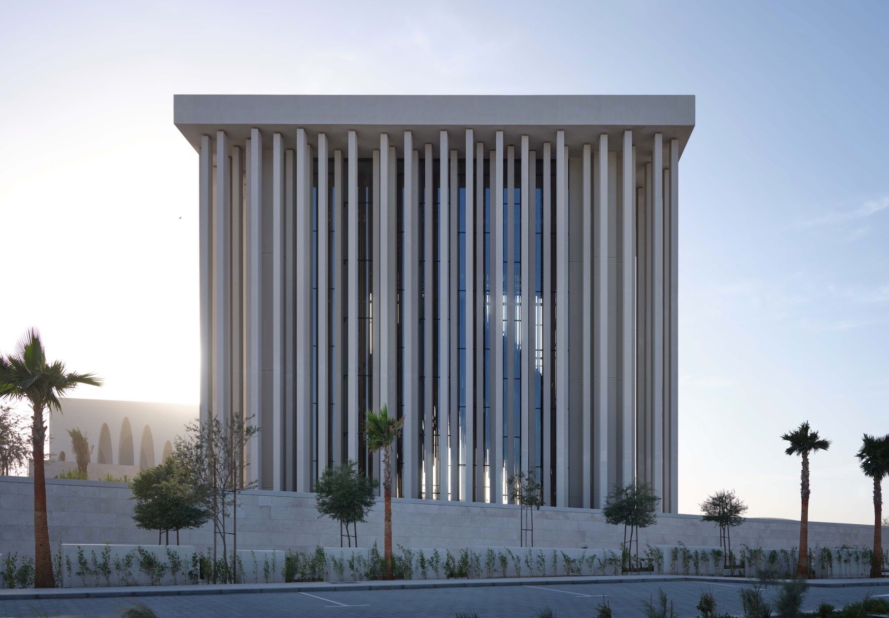 His Holiness Francis Church features a forest of staggered vertical colonnades, as viewed from the exterior of the Abrahamic Family House complex from the north.