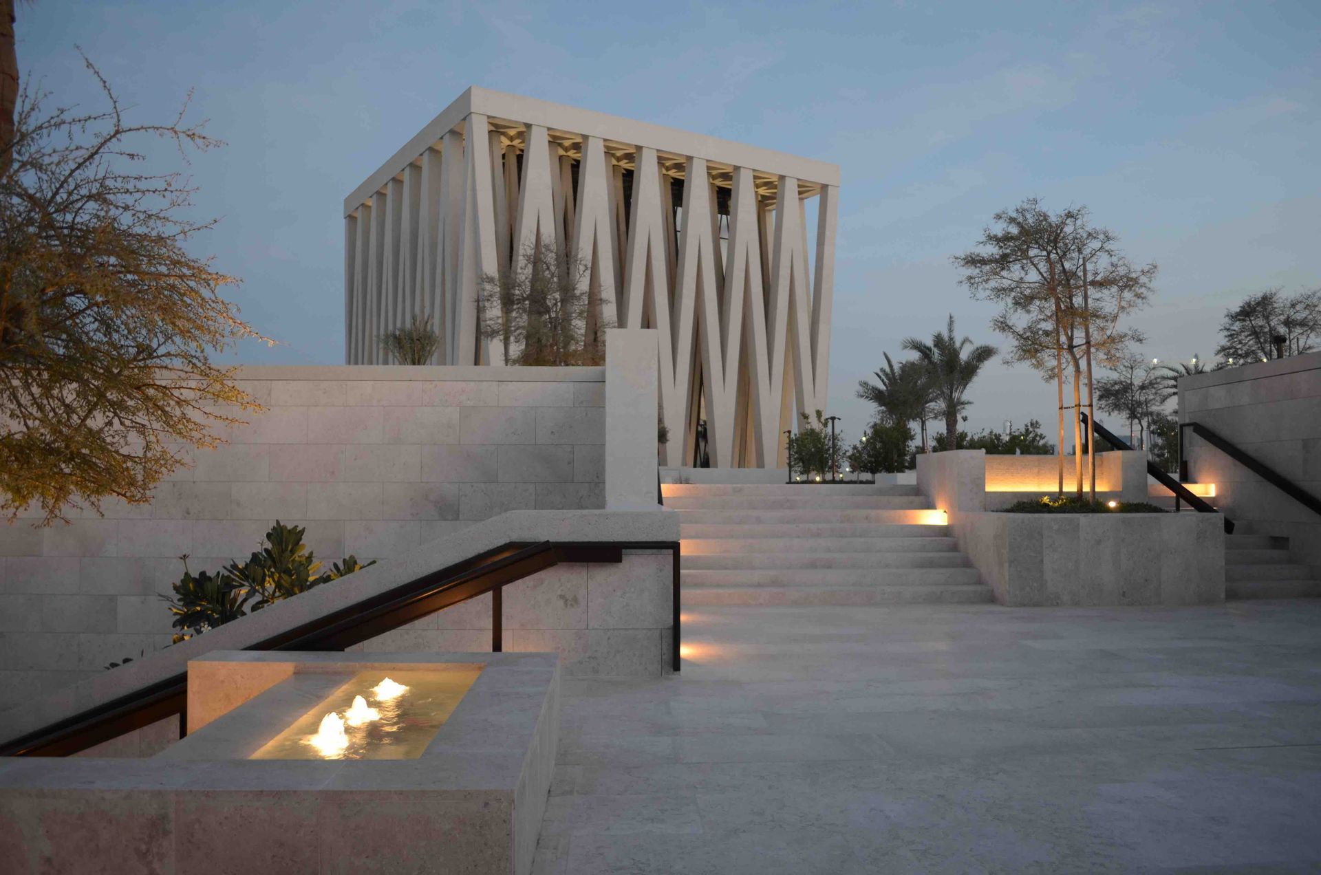 At dusk, an illuminated central staircase transitions from the complex’s one-story plinth to the Abrahamic Family House’s raised garden, with Moses Ben Maimon Synagogue in the background.