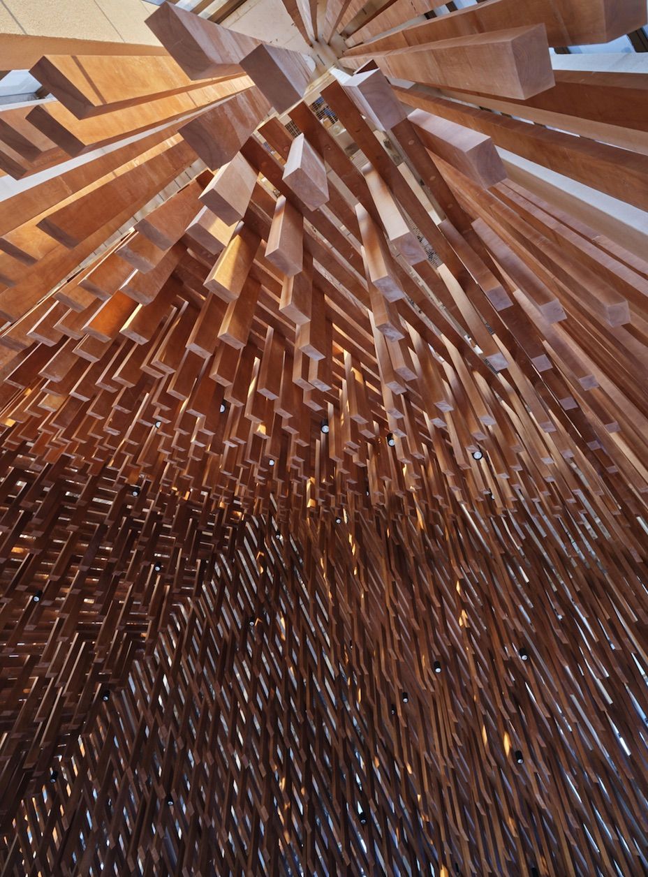 A forest of towering pillars symbolises vertical rays of light, while the pillars are aligned east-west so that daylight to flood the building in the morning and keep out the hot sun at noon. The design of the interior is based on the idea of an "ecstatic shower of redemption". Designed in a series of linear wooden slats, the "shower" rises in the centre and falls at the periphery. More than 13,000 linear metres of wood form the vault of the church. The oak pews were designed by Adjaye Associates and reference the vertical façade design of the church. The crucifix was deliberately designed to be minimalist to indicate that the church is open to all and will be used by several denominations. The baptistery is octagonal like ancient baptisteries. When the sun moves, the light penetrates the cone, creating additional light shadows in the space.