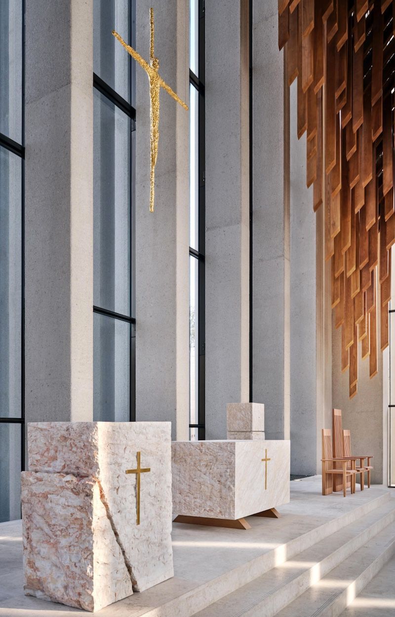 Suspended above the congregation in His Holiness Francis Church is a ceiling of timber battens that glow as sunlight enters the space.