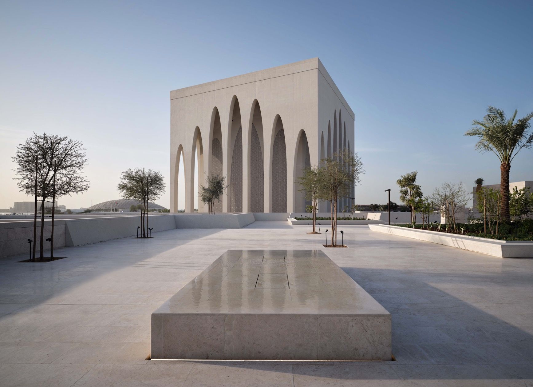 The Imam Al-Tayeb Mosque is distinguished by its elongated arches, as viewed from the Abrahamic Family House’s raised garden.