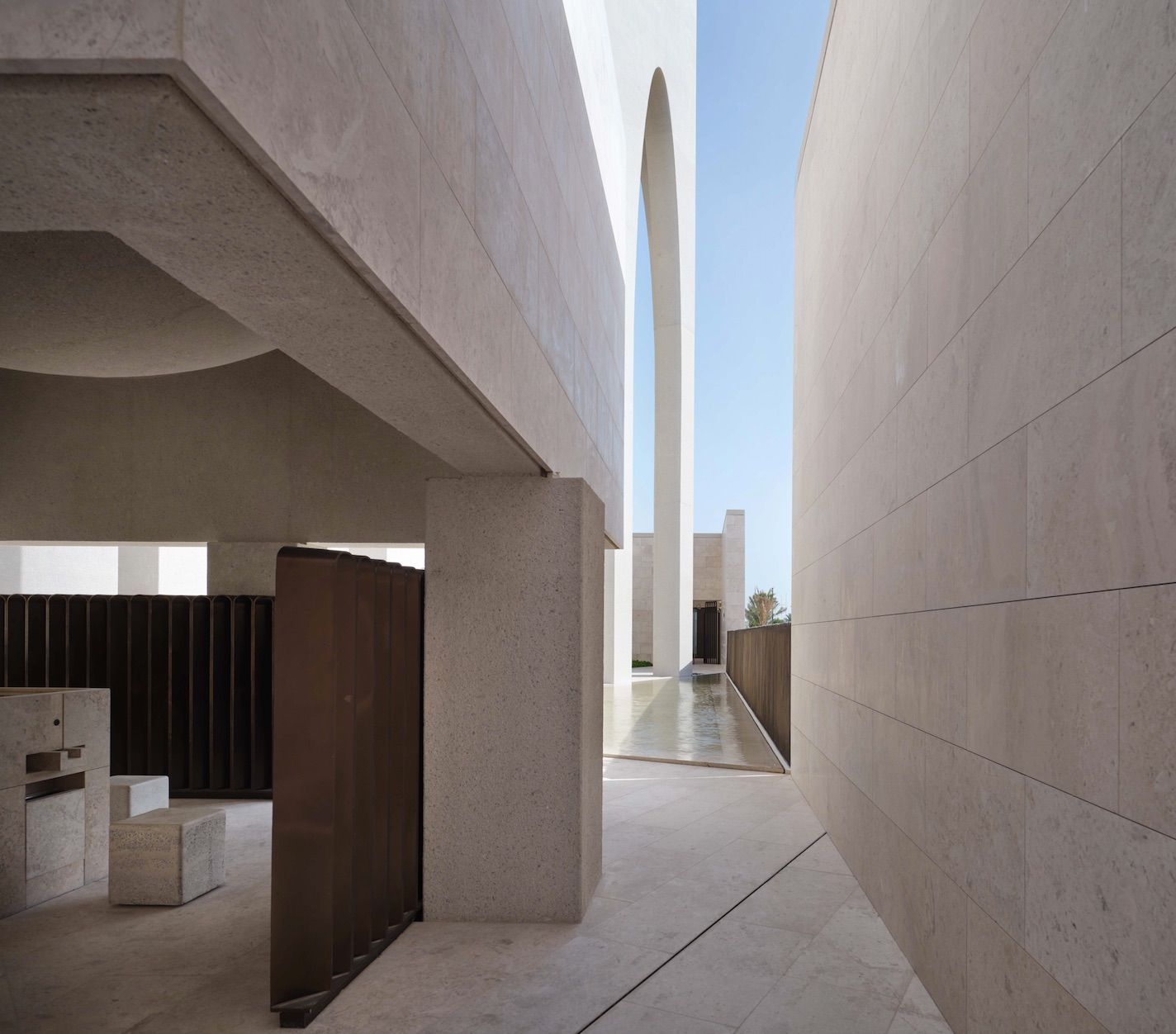 The two ablutions are screened by bronze gates that echo the arches that compose the exterior façade of the Imam Al- Tayeb Mosque; with a convex spherical ceiling above the space for performing wudu in the female ablution.