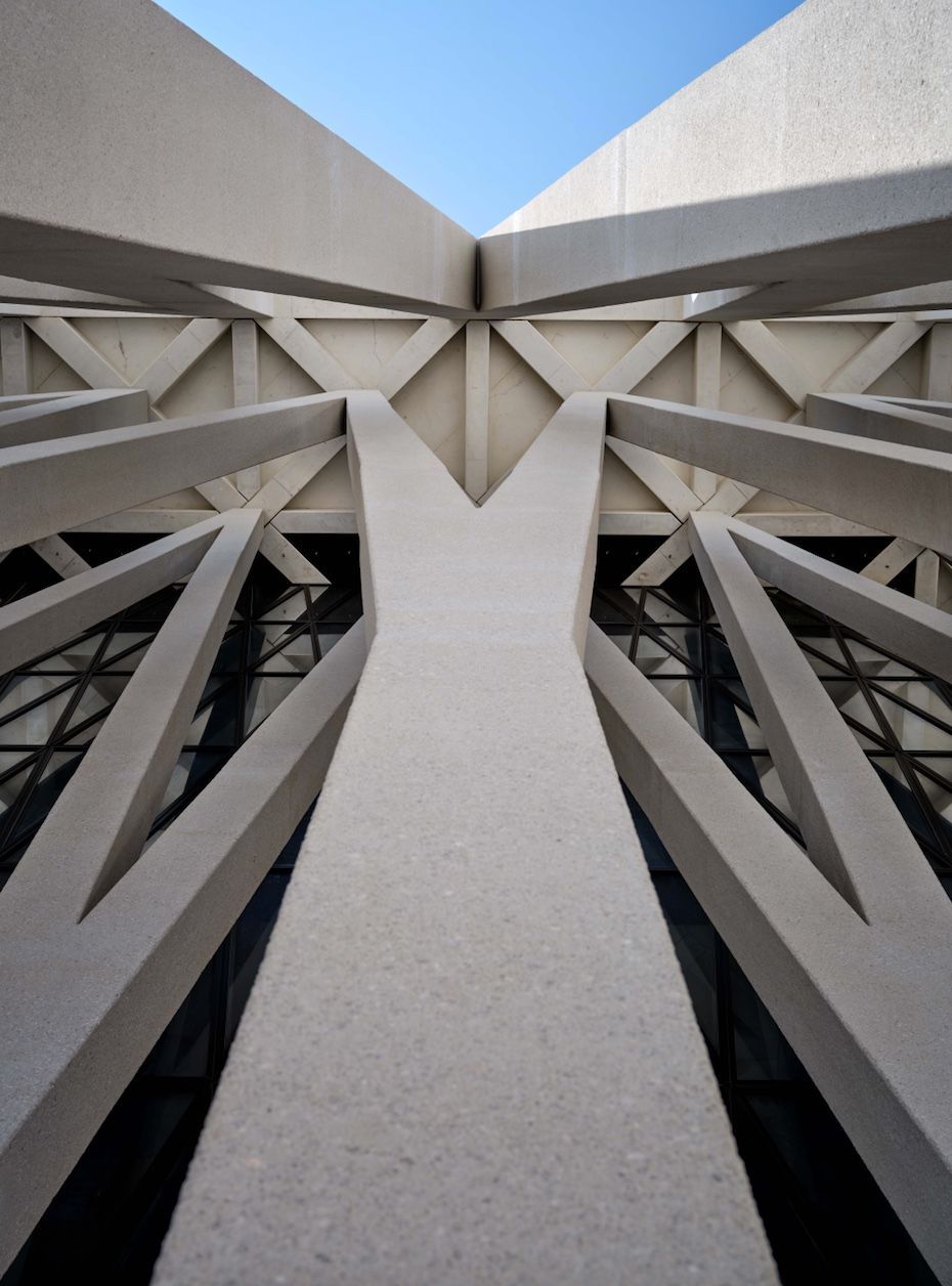 Three layers of concrete V-shaped columns surround the perimeter of the Moses Ben Maimon Synagogue symbolizing the overlapping palm fronds on the sukkah.